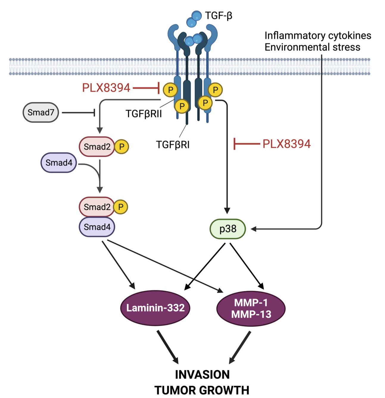Figure 1. A schematic representation of serine-threonine kinase inhibition by PLX8394. PLX8394 inhibits TGF-β signaling by attenuating phosphorylation of TGFβRII and Smad2. Concurrently, PLX8394 inhibits TGF-β-induced Smad2 and p38 activation resulting in decreased MMP-1 and MMP-13 production. PLX8394 does not inhibit p38 activation induced by inflammatory cytokines or environmental stress. As a result, laminin-332 expression is downregulated leading to decreased cSCC cell invasion and tumor growth. The figure was created with BioRender.com.