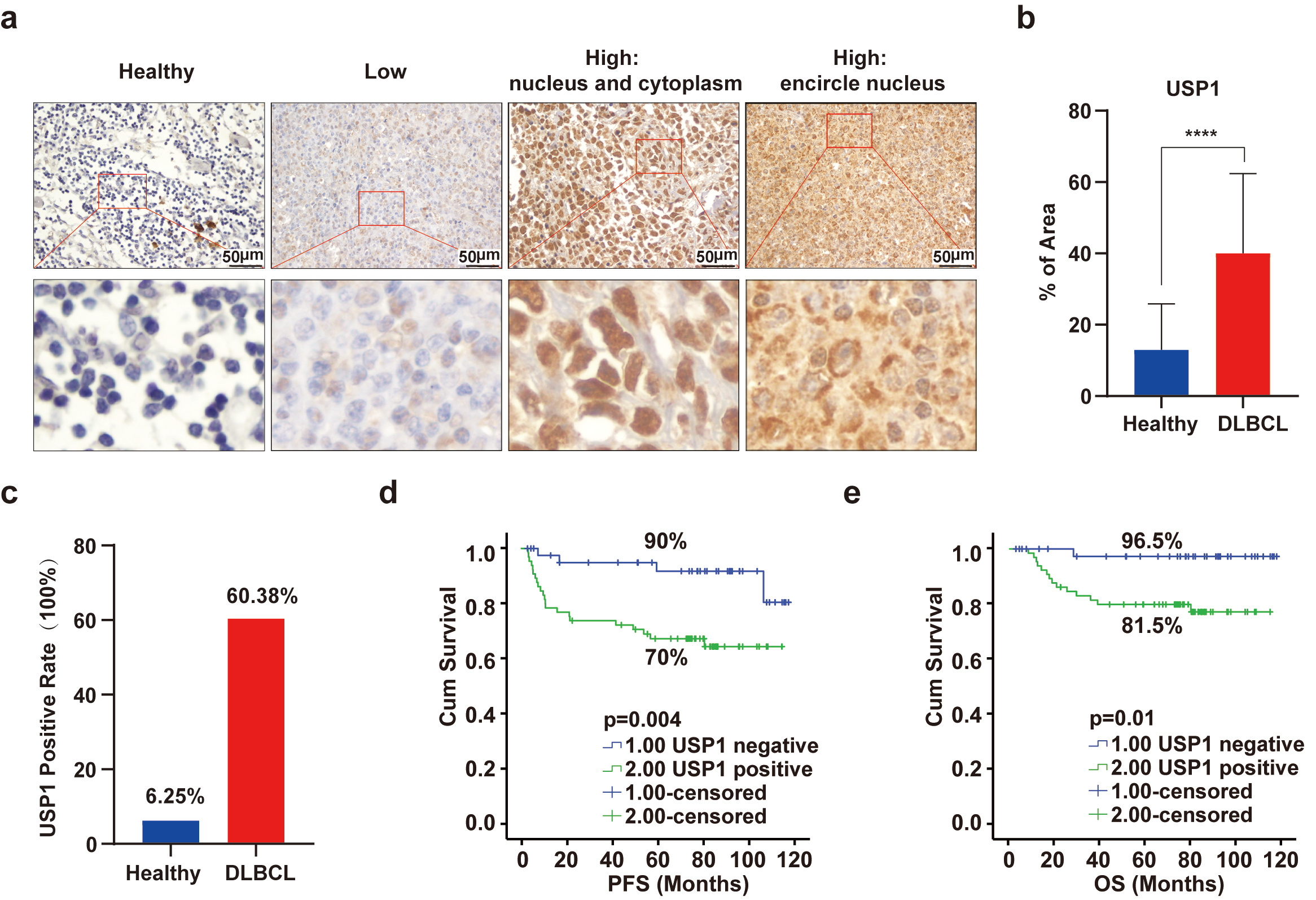 To elucidate the potential role of USP1 in DLBCL, we detected the expression of USP1 by using immunohistochemical (IHC) analysis in 106 newly diagnosed DLBCL samples and 16 normal lymph node tissue samples. Our clinical analysis showed that Ubiquitin-specific protease 1 (USP1) was highly expressed in diffuse large B-cell lymphoma (DLBCL) patients, and its high expression predicted poor prognosis (Figure 1).