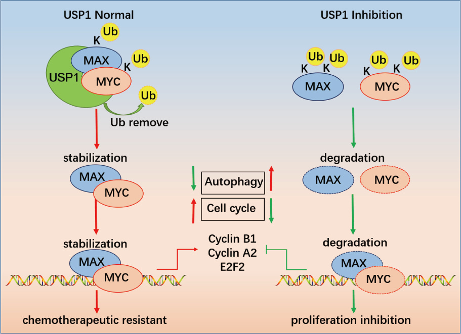 Our study suggests that Inhibition of USP1 reverses the chemotherapy resistance in the relapsed/refractory B Cell Lymphoma by destabilizing MAX and MYC. These findings suggest that USP1 has an important function in the relapsed/refractory DLBCL and may be a potential target for clinical therapy (Figure 2).