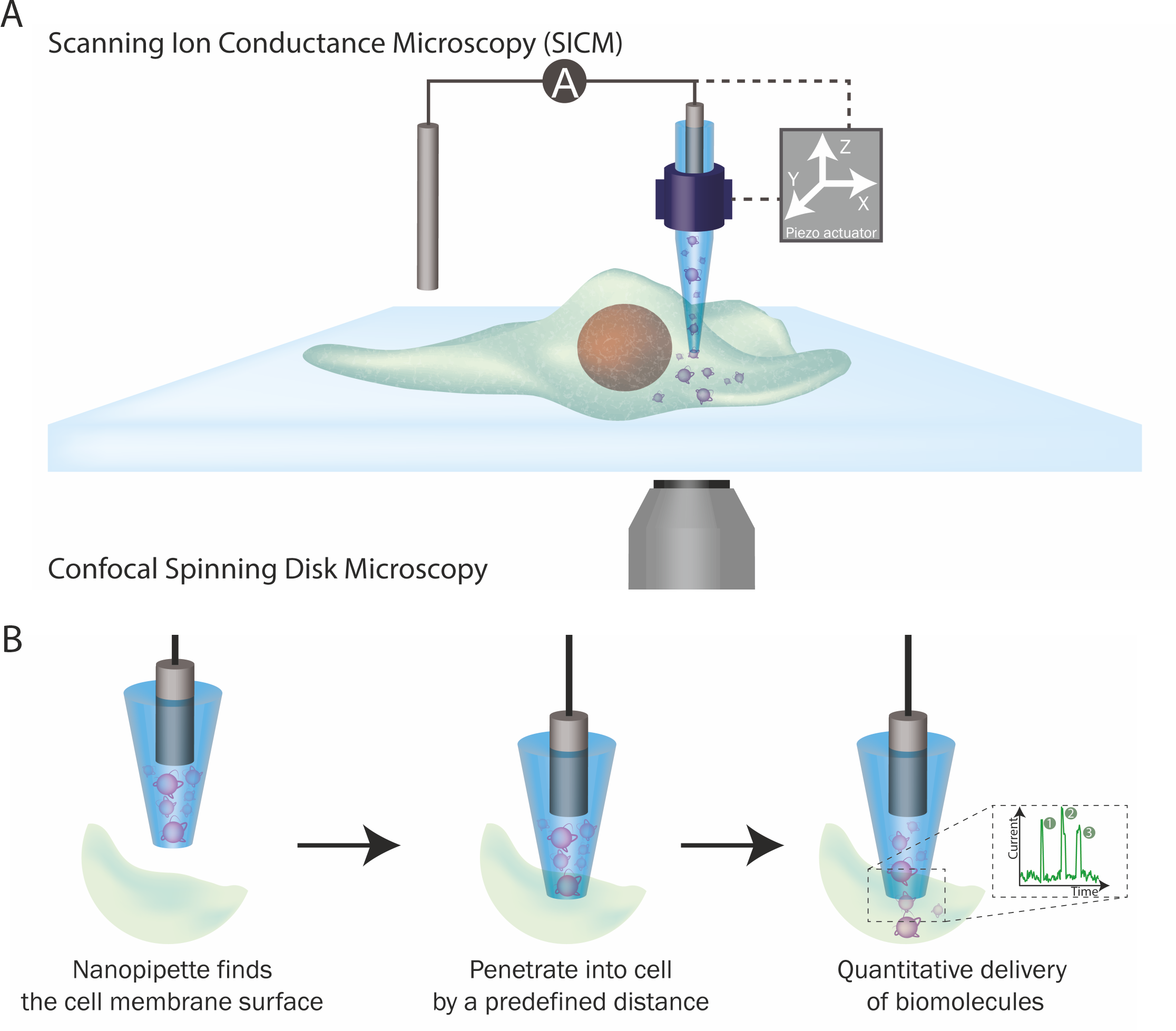 The integration of these two technologies led to the development of the single-molecule nanoinjection platform. A nanopipette loaded with biomolecules, is used as the SICM probe to approach a cell's surface and is then inserted into the cell at a defined depth. Once inserted, the voltage-driven translocation of each individual biomolecule from the nanopipette through the nanopore into the cell, generating a single ionic current peak. By quantifying the number of ionic current peaks, we can calculate the number of biomolecules delivered into the cell. Thus, the phenotypic effects of the biomolecules can then be correlated with the number of biomolecules delivered.