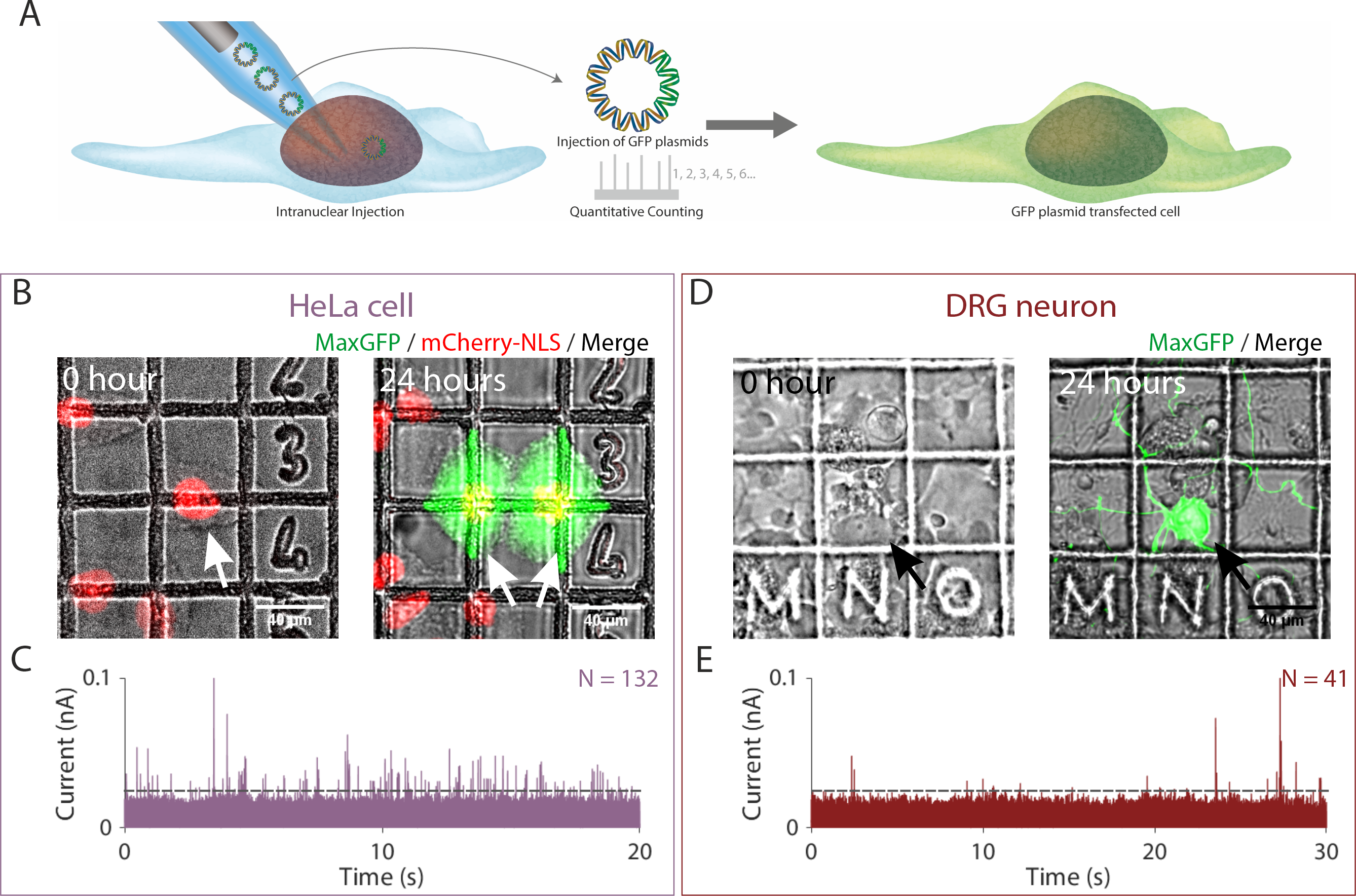 Figure 3. Quantitative nanoinjection of DNA plasmids into living cells. (A) Schematic of the nanoinjection of GFP plasmids (pMaxGFP) into the nucleus and the transfection of the cell. (B) The transfection of a HeLa cell expressing the nuclear localised mCherry-NLS (HeLa RNuc) with pMaxGFP plasmid through quantitative nanoinjection. HeLa RNuc cells were cultured on a grided dish to enable identification of the cell after nanoinjection. pMaxGFP plasmids were quantitatively nanoinjected into the nucleus of the cell (arrow). 24 hours later, the two daughter cells were imaged to confirm the expression of GFP from the injected pMaxGFP plasmids. (C) A snapshot of the current trace (20 seconds) recorded during the nanoinjection. Based on peak counting, a total of 132 pMaxGFP plasmids were nanoinjected into the HeLa RNuc cell. (D) The transfection of a DRG primary neuron with pMaxGFP plasmid through quantitative nanoinjection. 24 hours later, the neuron was imaged to confirm expression of GFP. (E) The current trace (20 seconds) recorded during the nanoinjection step. A total of 41 pMaxGFP plasmids were delivered into the DRG neuron. The dotted line in (C) and (D) indicated the threshold for events search.