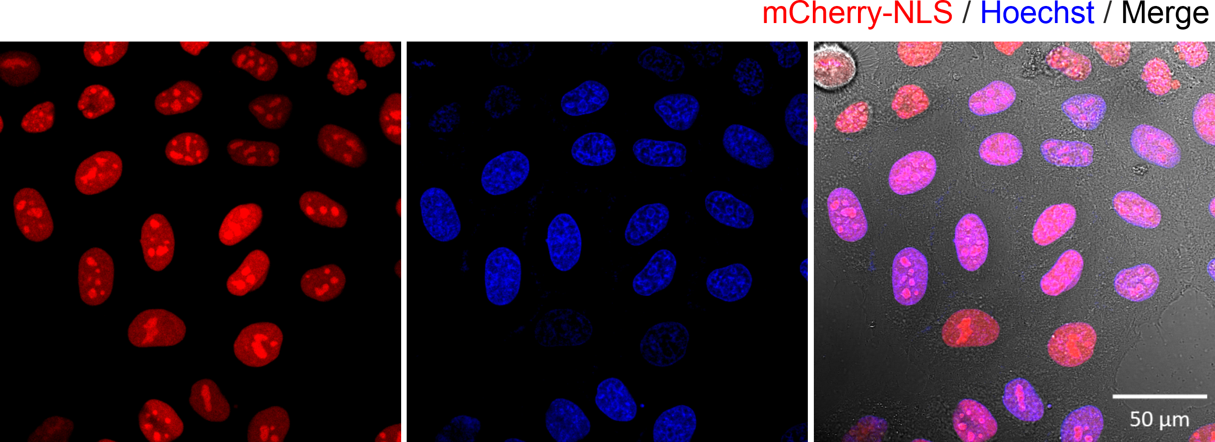 Figure 1. Fluorescence microscopy images of HeLa cells expressing the mCherry-NLS protein. The expressed proteins were found in the nucleus (co-localised with the Hoechst DNA dye). The transfection was carried out using lipofection transfection.