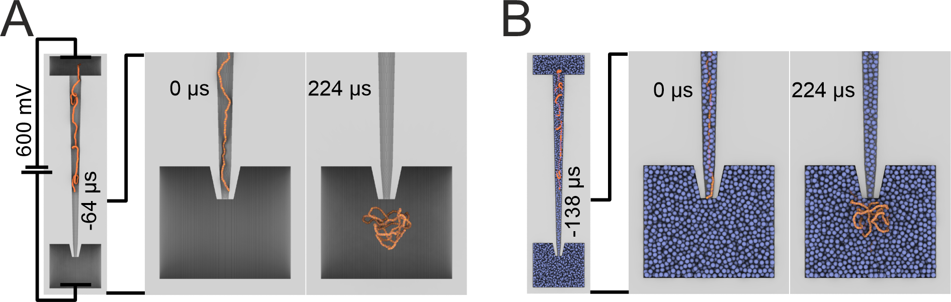 Figure 4. Coarse-grained simulation systems consisting of a 2.7 kbp dsDNA molecule (orange) driven out of a nanopipette (gray) by an applied electric potential into an electrolyte solution without (A) and with BSA (B) (blue). Each case (with or without BSA) consisted of an ensemble of 24 independent simulations.
