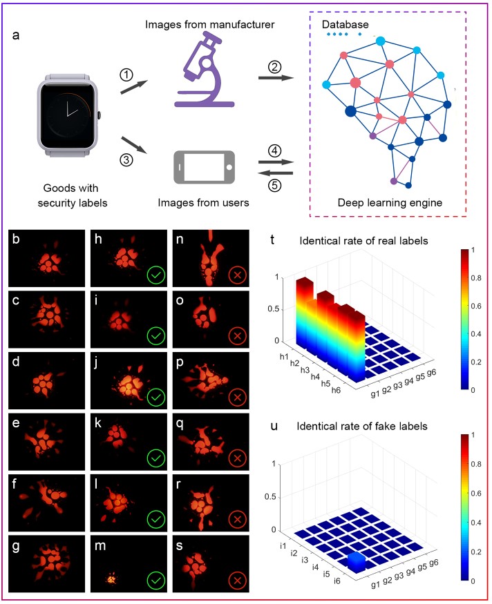Figure 2 | Deep learning decoding mechanism. (a) Schematic illustrating the authentication process: ① Image capture and database generation from the goods by the manufacturers, ② image learning by AI, ③ Image capture from the goods by the consumers using their smart phones, ④ image recognition and comparing by AI, and ⑤ authentication outcome feedback to the consumers. (b-g) A library of six single dot pattern security labels, (h-m) six fluorescence images taken from b (referred as to genuine product) with different brightness, sharpness, rotation angles, magnifications and the mixture of the above-mentioned factors, and (n-s) six fluorescence images from security labels that are not in the database shown in panel b-g (referred as to fake products). (t, u) Recognition rates of labels (h1-h6) and (i1-i6) by the authenticating way of deep learning. Labels (g1-g6), (h1-h6) and (i1-i6) correspond to the labels in Figure (b-g), (h-m) and (n-s) respectively. The color scales from blue to red stand for the matching score (ranging from 0 to 100%) of the captured pictures with the labels.