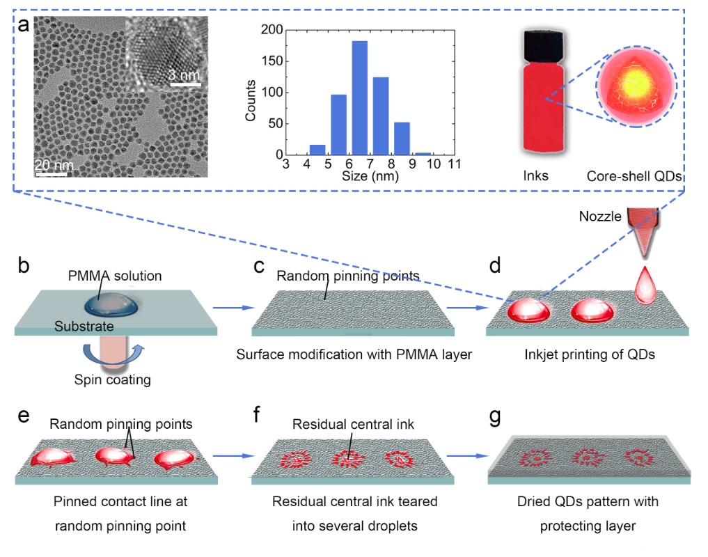 Figure 1 | Outline of formation processes of unclonable security labels by inkjet printing. (a) Typical TEM/HRTEM images (left), particle size distributions (middle) and ink for inkjet printing (right) of red core-shell quantum dots (QDs). (b) Surface modification of a substrate with partly-dissolved PMMA solution by spin coating. (c) Substrate with random-distributed pinning points of PMMA nanoparticles on PMMA film after spin coating. (d) Inkjet printing of prepared QDs ink on the modified substrate. (e) Pinning process of QDs droplet contact line at random pinning points. (f) Residual central ink teared in to several smaller droplets in the final evaporation process. (g) A resulting security label composed of flower-like dot patterns, which are protected with a thin, optically transparent sticky gel film.