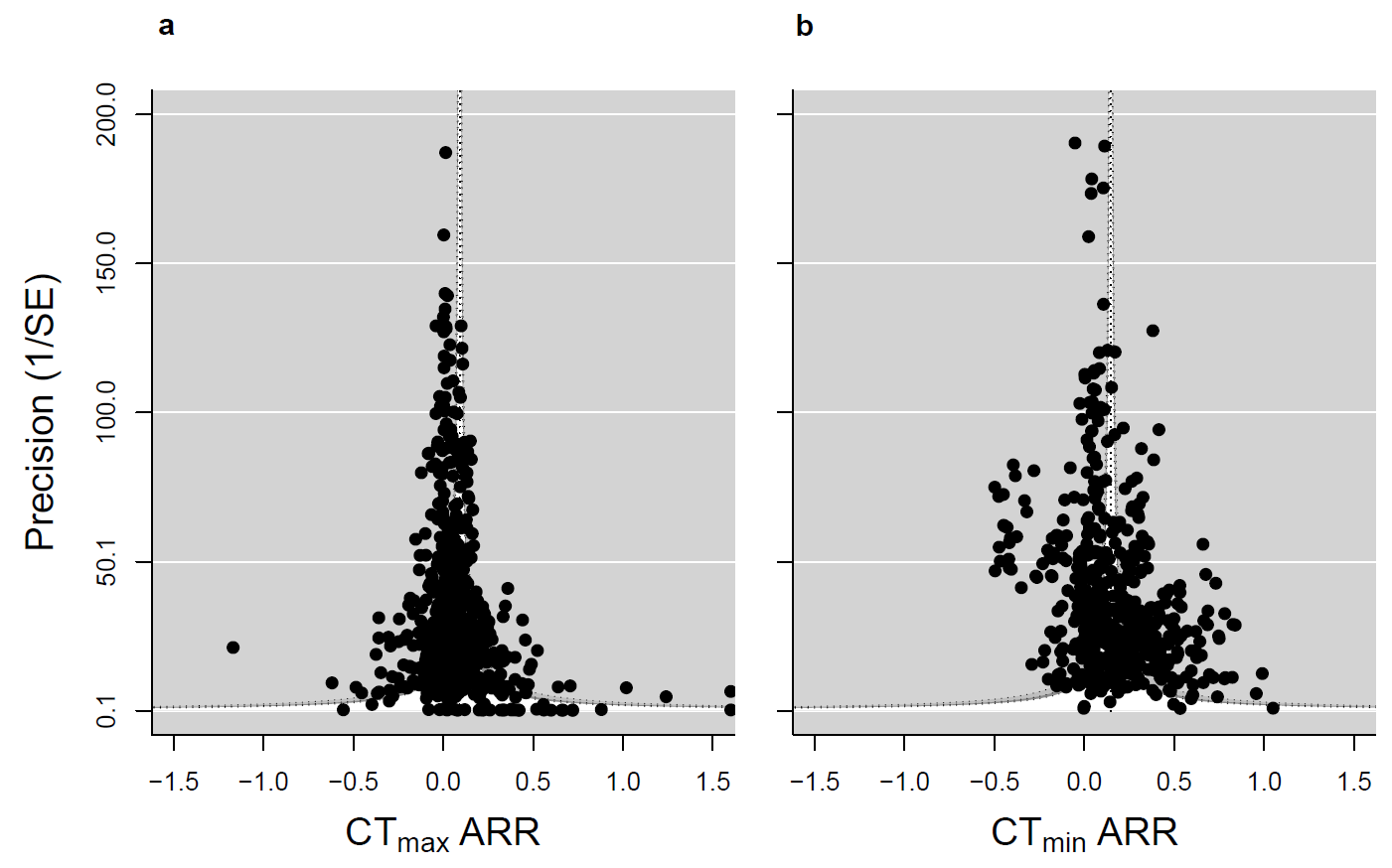 We then calculated ARR - Acclimation Response Ratio - the change in critical thermal limit with a given change in acclimation temperature. 100% compensation by acclimation would mean an acclimation response ratio of 1, for example. This would mean for every 1°C change in temperature, the critical thermal limit would also change by 1°C.