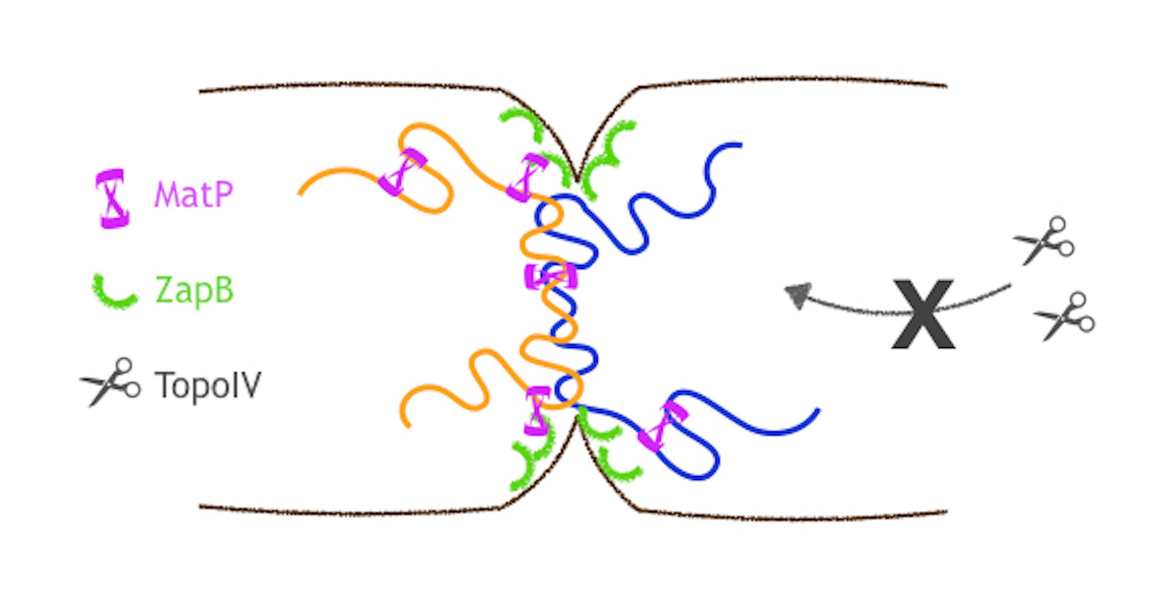 In E. coli, a particular chromosomal domain, called ter, connects the end of the replication process with the cell division, through interactions with proteins located at the septum (where the cell will divide). One of these essential "linkers" is the MatP protein, which binds a few sequences in ter and - potentially - a protein at the septum, so ter is localised at mid-cell until the sister chromosomes have been segregated and are ready to finally separate before cell division.