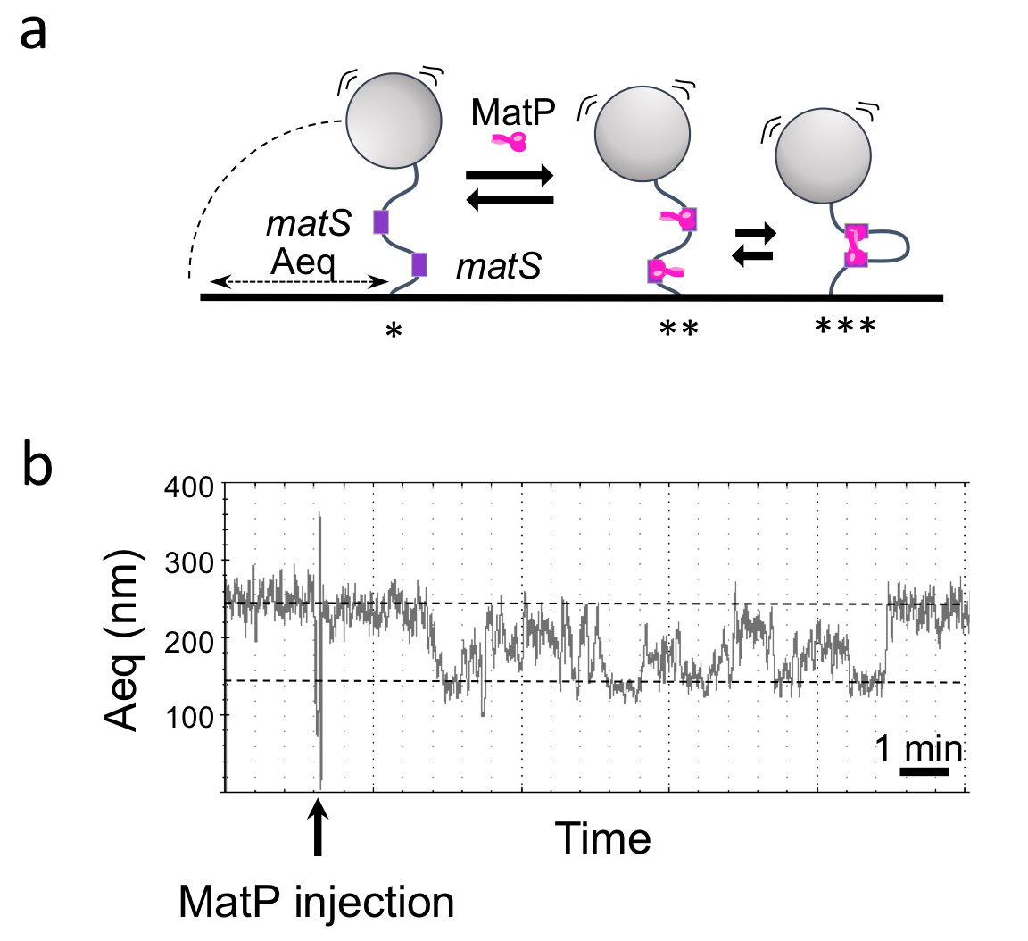 a. A bead is attached to a single DNA molecule (*). When a protein binds (here, MatP binds matS sites), this induces a conformational change (**) or a loop (***), which reduces the apparent length of the DNA, and therefore the Brownian motion of the bead.