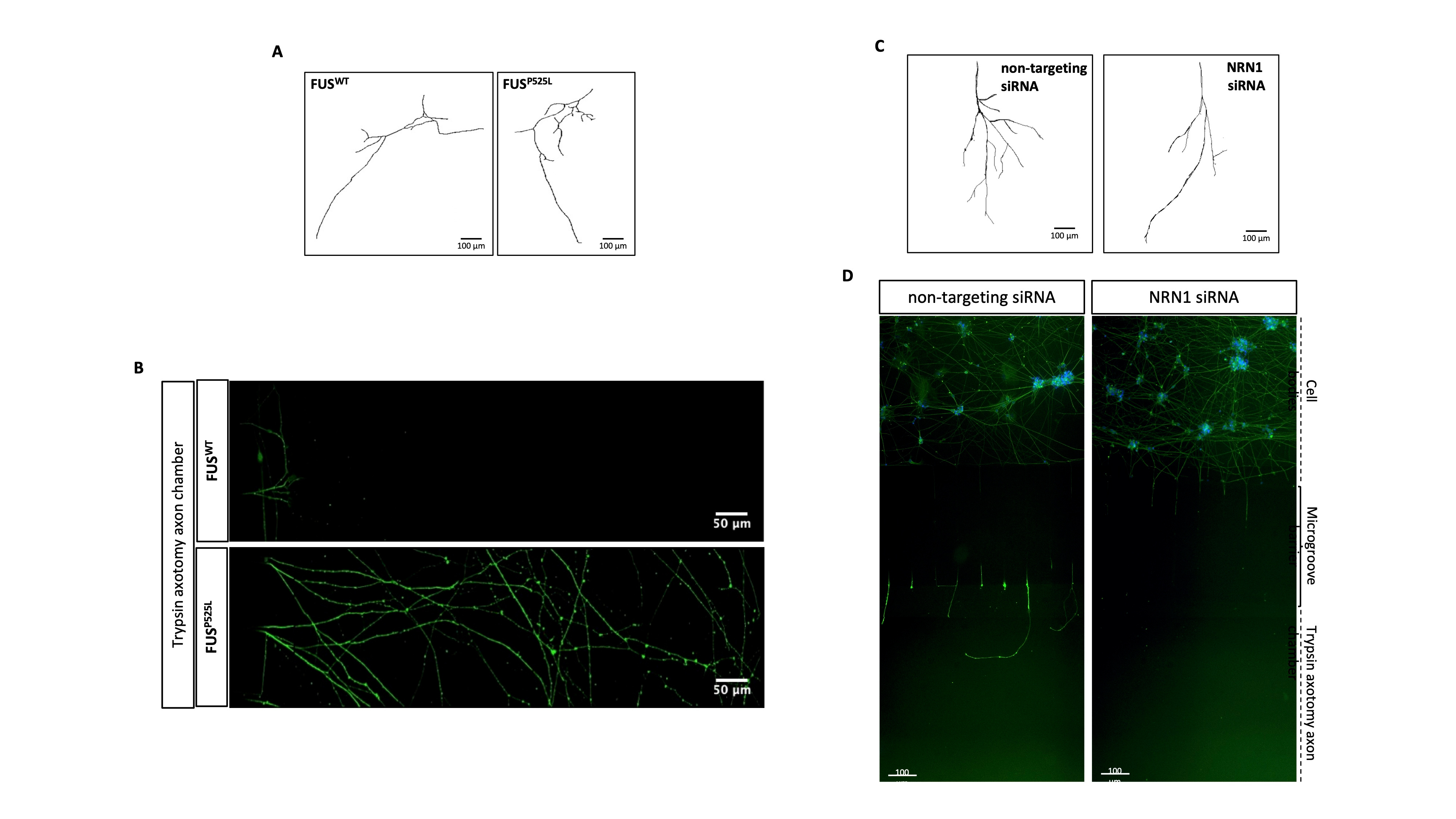 Figure 2 Axonal phenotypes analysis of human iPSC-derived spinal motor neurons in microfluidic devices. (A) Terminal axon representative images of FUSWT and FUSP525L MNs. (B) Immunostaining of TUBB3 (green) in wild-type and mutant FUS MNs allowed to recover for 30 hours after the trypsin treatment to induce axotomy. (C) Terminal axon representative images of FUSP525L transfected with the indicated siRNA pools. (D) Immunostaining of TUBB3 (green) in FUSP525L transfected with the indicated siRNA pools and allowed to recover for 30 hours after the trypsin treatment to induce axotomy. Modified from: Garone, M.G., Birsa, N., Rosito, M. et al. ALS-related FUS mutations alter axon growth in motoneurons and affect HuD/ELAVL4 and FMRP activity. Commun Biol 4, 1025 (2021). https://doi.org/10.1038/s42003-021-02538-8