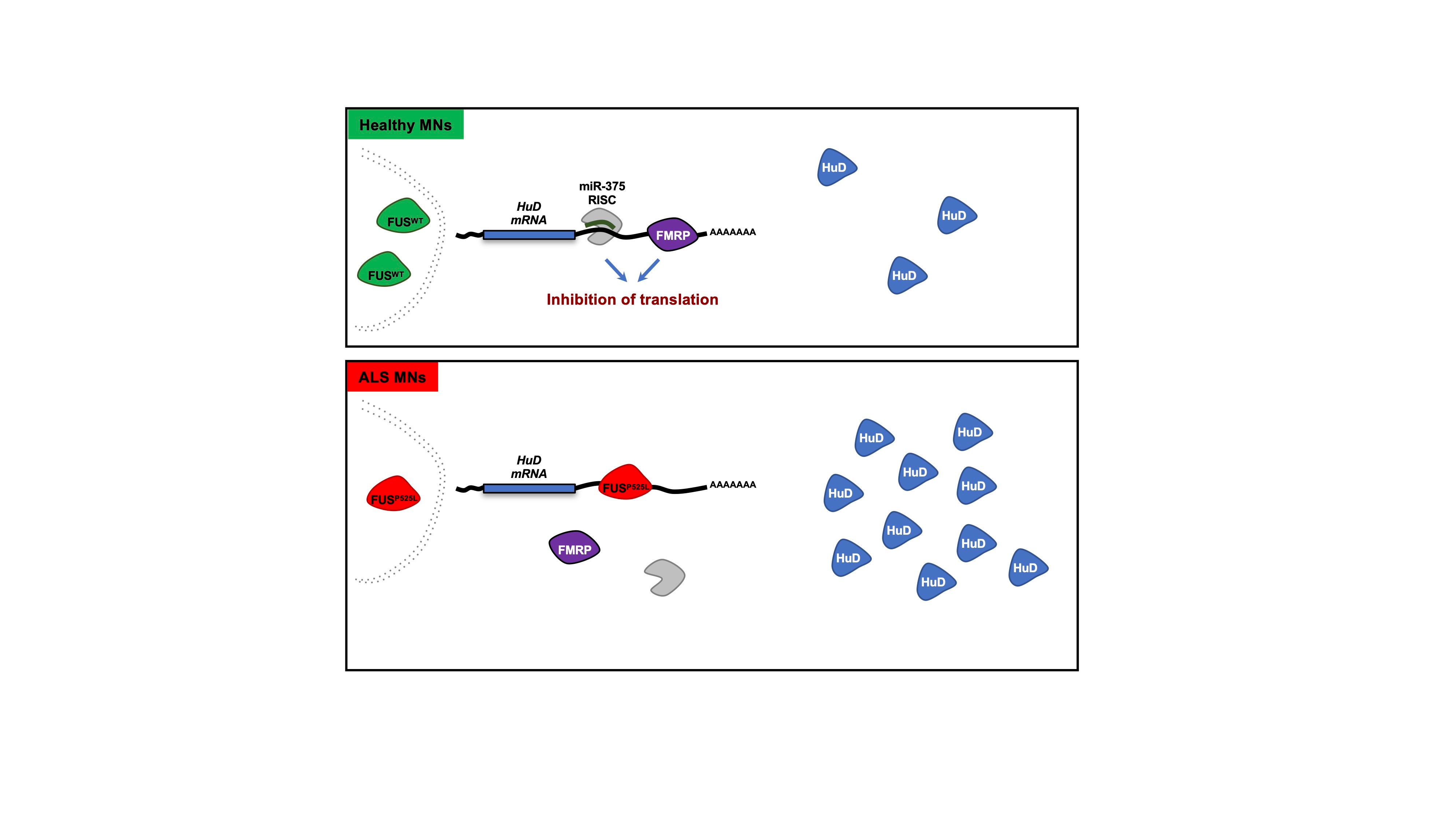 In order to define the molecular mechanisms and functional consequences of HuD and mutant FUS interplay in ALS, we took advantage of spinal motor neurons obtained from FUS mutant human induced pluripotent stem cells (iPSCs) [9-10] or from a FUS mouse model [11]. We found that the mutant FUS protein intrude with the functions of FMRP, which we characterized as a novel regulator of HuD. In healthy motor neurons, FUS is confined in the nucleus and FMRP negatively regulates HuD translation. In ALS motor neurons, however, cytoplasmic mislocalization of mutant FUS undermines the FMRP negative role by competing for HuD 3’UTR binding, causing aberrant increase of HuD protein levels. Thus, a real struggle for HuD mRNA grasping between mutant FUS and FMRP determinates the levels of HuD protein (Figure 1).