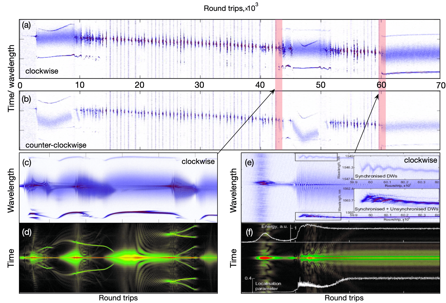Our paper marks an important milestone towards an understanding of counter-propagating pulse dynamics, their collision, and interchange of energies. In this aspect, the platform of bidirectional ultrafast lasers, together with the use of real-time measurement techniques offer us a unique opportunity to study these effects directly in the experiment. For instance, in our paper, we have now reported the direct observation of synchronized and unsynchronized dispersive waves in our laser – a nonlinear phenomenon that had been insofar reported only theoretically. This is beyond the diversity of the laser dynamics we observed in general, as mediated by nonlinear interactions in the fibre and gain medium. The figure below shows one of recorded build-up dynamics (a,b), involving wavelength drift, the formation of soliton complexes (c,d), Q-switch instabilities, mode-locked generation, the formation of synchronised and unsynchronised dispersive waves (e,f). The sheer diversity of the observed phenomenon shows the power of direct experimental observations of such complex systems and demonstrate their potential to feed back into our theoretical understanding of them.