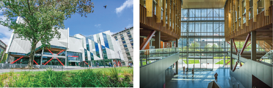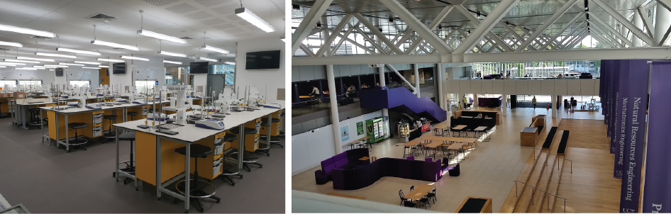 Left: Teaching laboratories in the Ernest Rutherford Building. Right: The spacious Engineering Core.