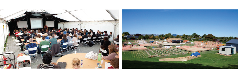 Left: A typical teaching marquee. Right: Kirkwood temporary village under construction. Photo credit: University of Canterbury.