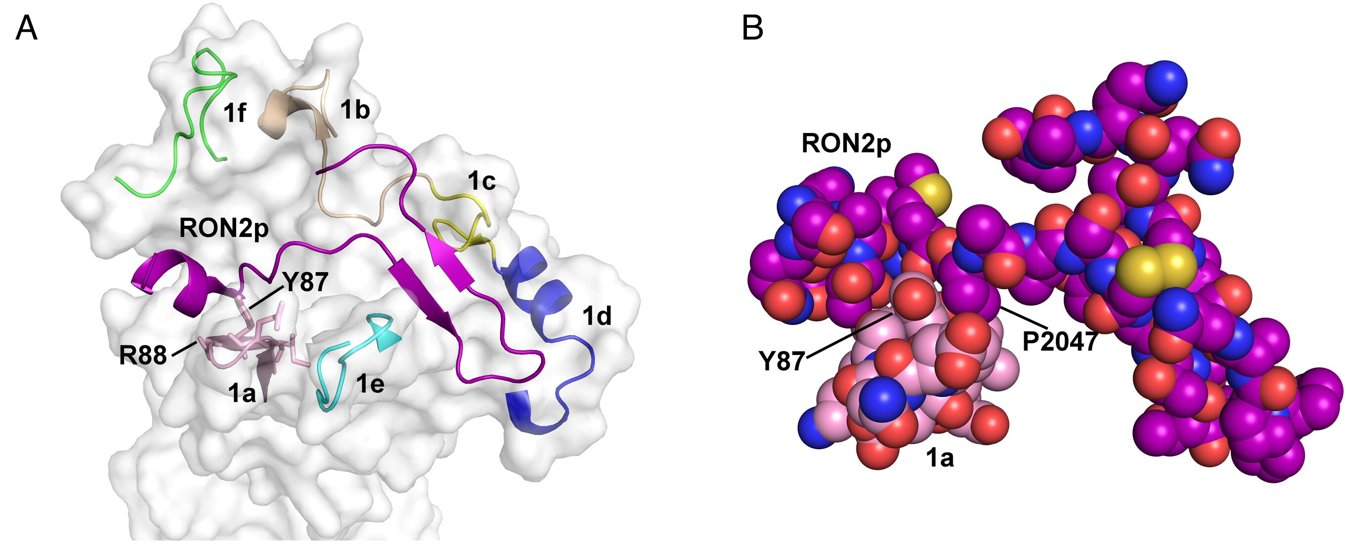 Figure 2: (A) Molecular surface of PvAMA1 with PvRON2L-interacting loops (labeled 1a–1f) (23) is shown in ribbon format. PvAMA1 Loops 1a (pink), 1b (tan), 1c (yellow), 1d (blue), 1e (cyan) and 1f (green) surround the bound RON2L peptide (purple). Side chains of PvAMA1 Loop 1a that contact the PvRON2L ligand are shown in stick representation; Arg 88 and Tyr 87 are labeled. (B) Space-filling representation of PvAMA1 Loop 1a (carbons colored pink) and the PvRON2L peptide (carbons colored purple) showing the intimate association of the loop with the peptide. Residues Tyr 87 from PvAMA1 and Pro 2047 from RON2L are labeled. Oxygen atoms are colored red, nitrogen atoms blue and sulfur atoms yellow. From Lee SK et al, PNAS 2023. https://doi.org/10.1073/pnas.2215003120