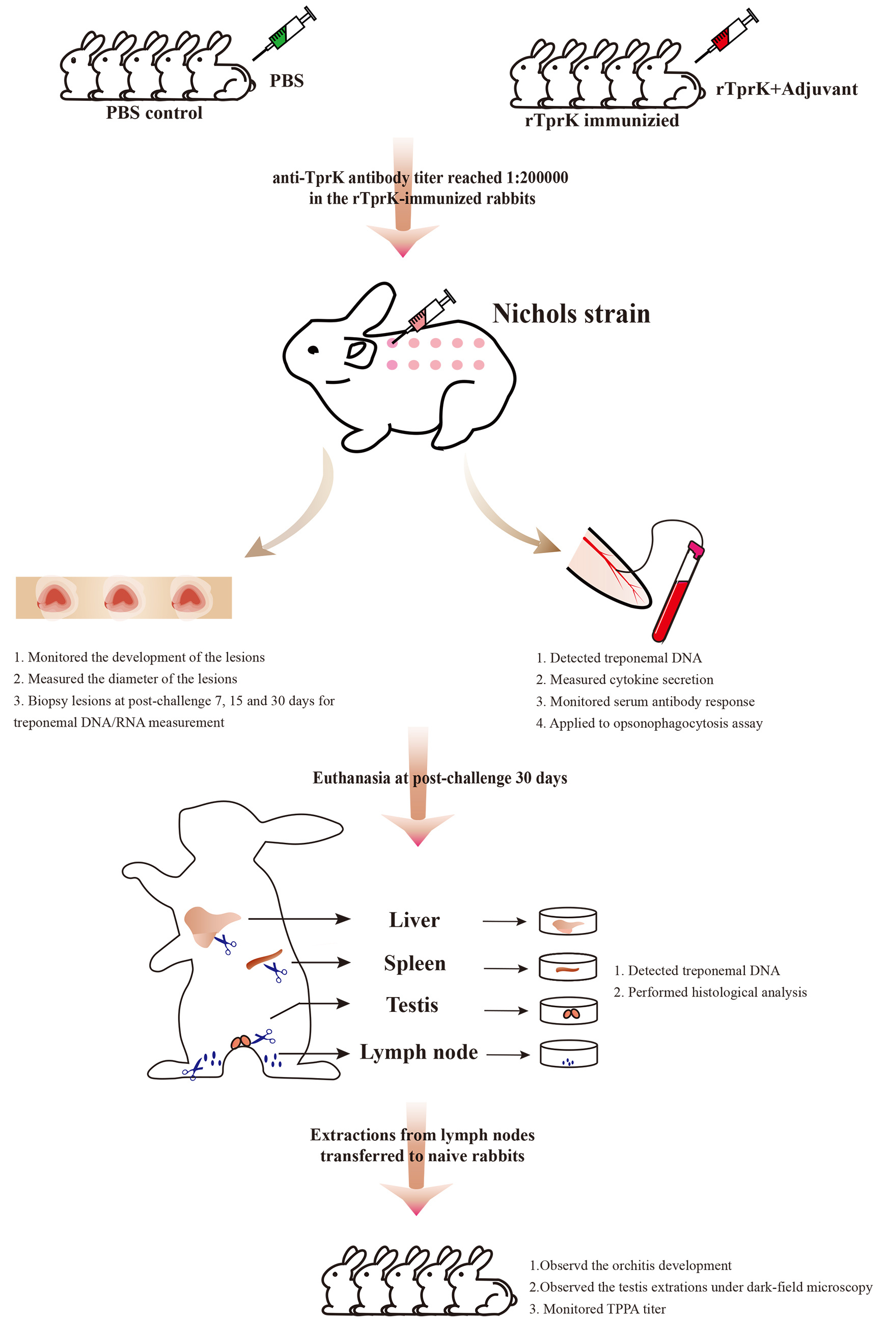 After confirming the availability of the purified rTprK, we began to immunize the rabbit until the titer of the anti-TprK antibody reached 1:200,000. It took approximately six weeks. Then 10 days after the final immunization (on February 18th, 2022), all rTprK-immunized rabbits and control rabbits were anaesthetized with acepromazine via intramuscular injection at 1 to 3 mg/kg body weight and challenged intradermally with 0.1 mL of 1×107 /mL fresh T. pallidum (Nichols strain) at 10 sites on their shaved backs. The following observations and measures were according to Figure 1 shown. This animal experiment took more than six months. All team members worked hard to arrange the experiment plans based on the obtained results, especially Prof. Yang and Dr. Tong, who not only proposed the idea but provided many good suggestions for improving experimental protocols.