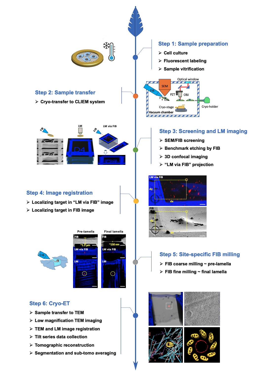 Figure 1 Workflow of cryo-ET sample preparation using the cryo-CLIEM system. Step 1: cells are cultured on EM grids, labeled with fluorescent probes, and vitrified by plunge freezing. Step 2: the vitrified samples are transferred to the CLIEM system using a custom-built cryo-transfer system. Step 3: the cells are screened by SEM and FIB imaging, and a benchmark is etched on the grid bar beside the candidate cell. Then the sample is moved to LM position and 3D confocal image is acquired. By projecting the 3D image along the direction of FIB milling, a 2D image referred to as “LM via FIB” is created. Step 4: “LM via FIB” and FIB images are registered, and the target is localized in both images with respect to the etched benchmark. Step 5: a pre-lamella is fabricated by FIB coarse milling at the determined position of the target. Under the guidance of “LM via FIB” of the pre-lamella, the final lamella is prepared by FIB fine milling. Step 6: the sample is transferred to TEM, and a low magnification image is acquired and registered with the LM image to locate the target. Finally, cryo-ET data is collected, reconstructed and analyzed.
