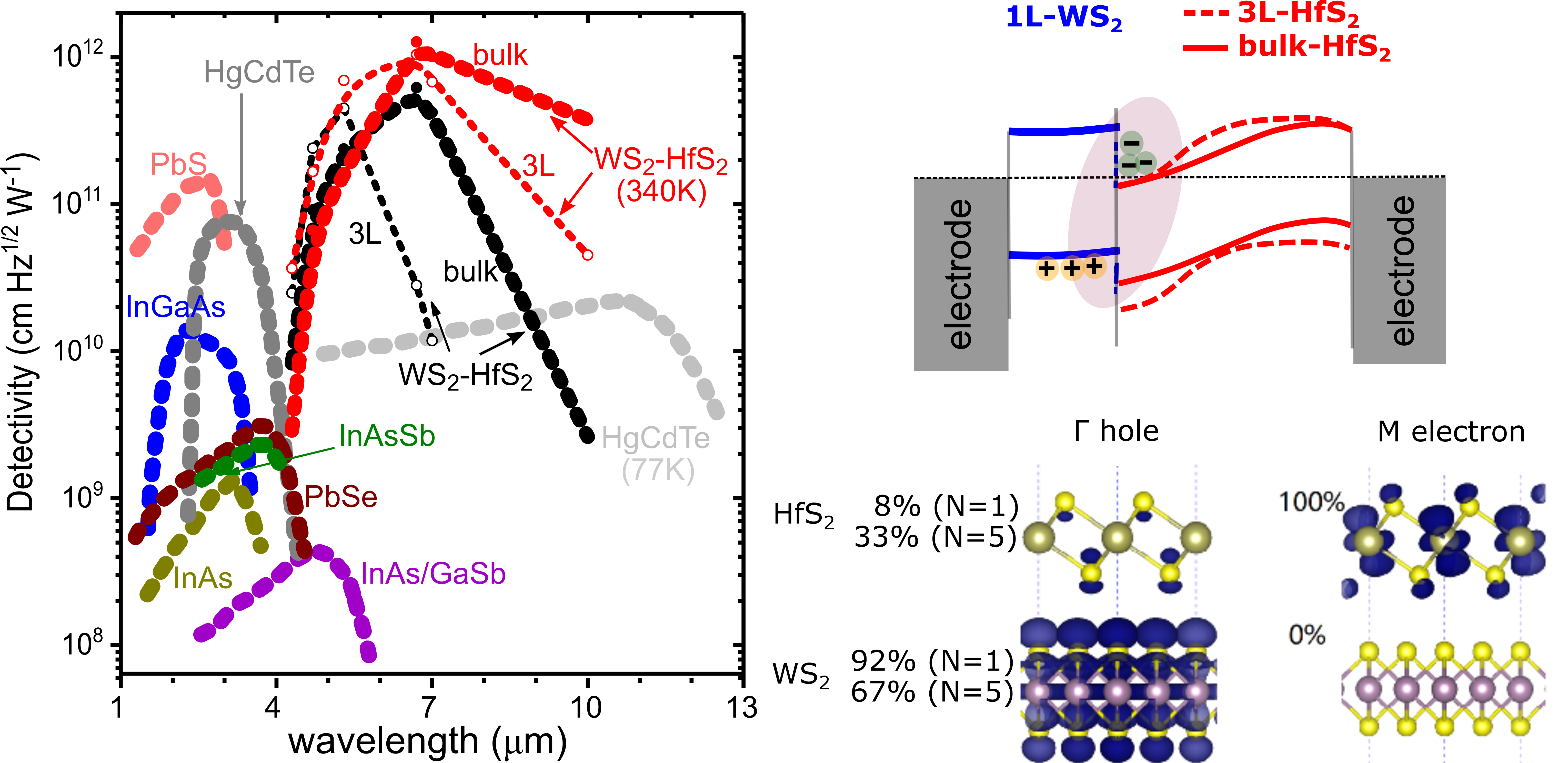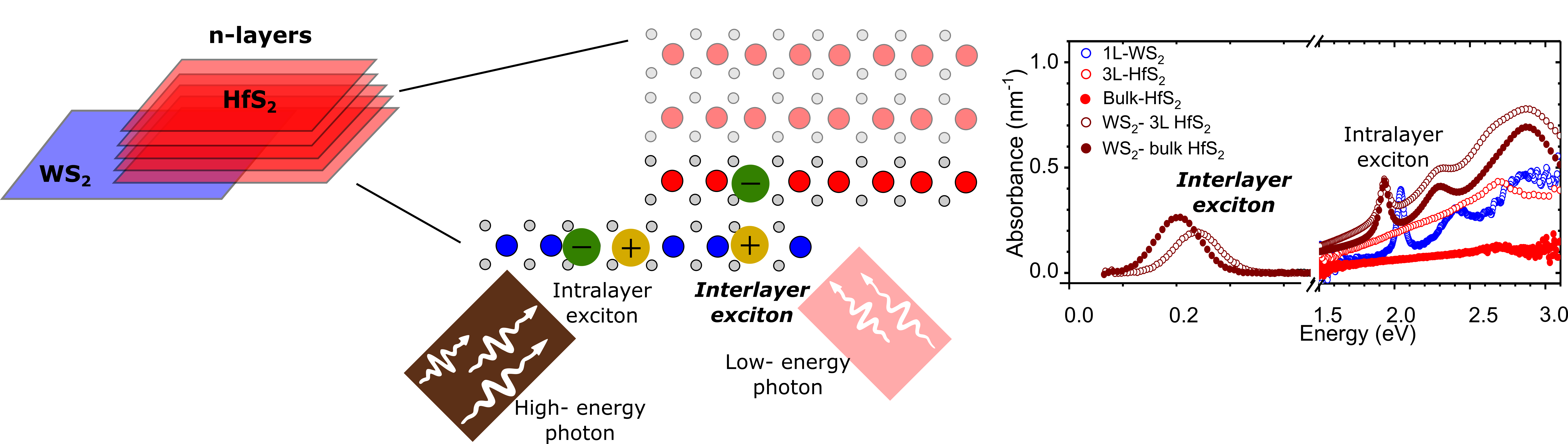 The sensitivity of ILEs to the thickness of two-dimensional materials and the external field provides an excellent platform to realise a robust tunable room temperature infrared photodetector, and potentially as a photo-emitter. However, the potential does not end here. The versatility of ILE in 2D heterostructures is not limited only to two materials (AB stacking). We can create a more sophisticated structure either ABA or ABC stacking by adding another similar (ABA) or dissimilar (ABC) material on top of the second material. The ABA stacking potentially produces a ‘quantum well’ structure, which could increase the efficiency further from AB stacking. Whereas ABC stacking allows the simultaneous formation of two different types of ILEs, which could be tailored for either dual photo-detection or -emission system.