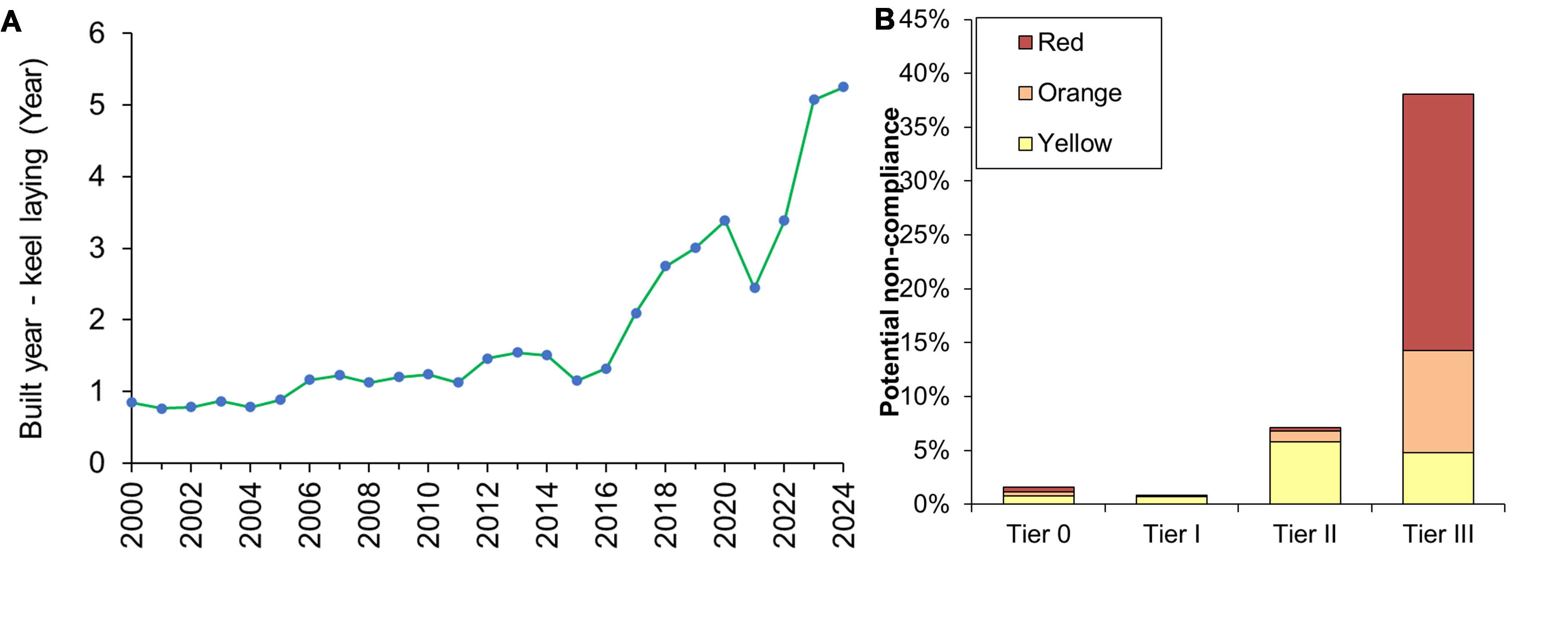 Figure 8. Evolution difference built year - keel laying year (A). Potential NOx non-compliance per tier (B).