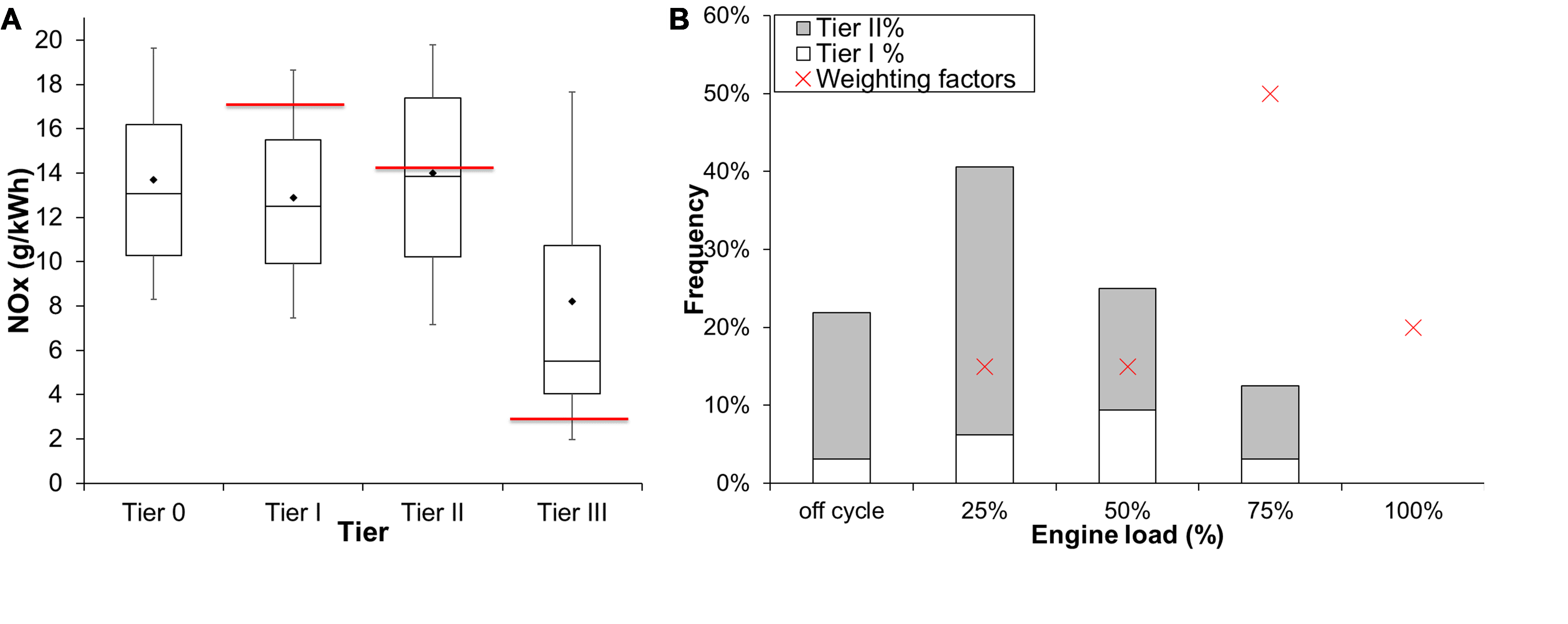 However, for nitrogen oxides it was found that the international ship emission regulations did not affect the real world emissions from ships. It was in fact observed that NOx emissions from ships even increased. Surprisingly, the measurement data from several monitoring operations indicate that more recently built ships (Tier II) are emitting more NOx than older ships (Tier I) (fig 7A). This is caused by certain regulatory gaps. One of the problems with the regulations is that they focus on the emissions that are generated at high engine loads, while trends indicate that ships more often sail on lower loads, especially in the ECA and close to shore or port (fig 7B).