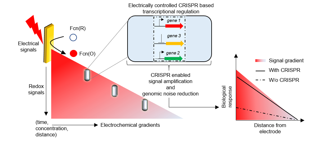 Technology has played a transformative role in our lives and its impact on human health is never felt more than in the current times of the Covid-19 global pandemic. In this scenario, development of autonomous health sensing and actuating systems, also referred to as closed loop systems that ‘sense’ and ‘act’ towards a biological condition (Kovatchev et al., 2009; Berényi et al., 2012), can play a critical role in addressing health crises of the future. Successful adoption of electronic closed loop human health systems is dependent on the development of new methods for biological actuation which has so far been limited to the century old neural stimulation and optogenetics. Recent advances in the field of biological actuation stems from synthetic biology where our group and others have reported gene circuits that respond to electric signals with expression of specific gene of interests (Weber et al., 2008; Tschirhart et al., 2017; Krawczyk et al., 2020). In a prior publication, our group had detailed a redox-based bacterial promoter SoxS that responds to specific electrochemical signals that can be generated via an external electrode. Using this promoter, specific transgenes of interests can be expressed in bacteria in response to programmed electric stimuli. In this work, we have taken the next logical leap for this technology, that is, using electric signals to connect and control transcriptional networks in the genome of the cells (Bhokisham et al., 2020).