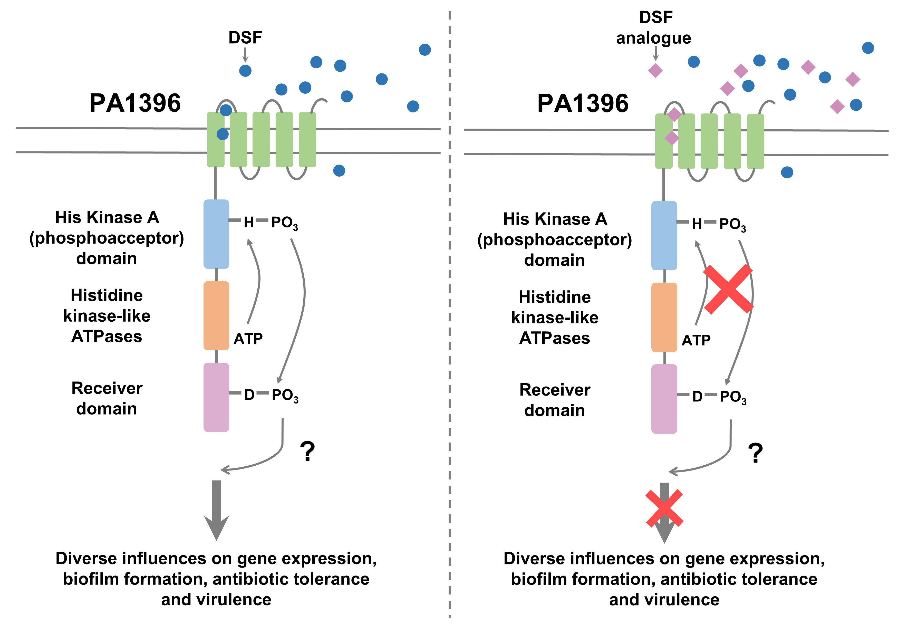 In previous work we showed that the opportunistic pathogen Pseudomonas aeruginosa can participate in interspecies signalling with other bacteria mediated by molecules of the DSF (diffusible signal factor) family, which are cis-2-unsaturated fatty acids. Sensing of these signals involves the histidine kinase PA1396 and leads to altered biofilm formation and increased tolerance to a number of antibiotics. In the current work we examined the ability of a panel of DSF structural analogues to modulate or inhibit PA1396 action as a potential approach to improve the efficacy of existing antibiotics. We established that that the membrane-associated sensory input domain of PA1396 has five trans-membrane helices (TMH). By using a DSF-activated reporter in a series of strains with progressive deletions of this region, we could show that TMH IV and V are required for DSF sensing. In a liposome assay, DSF binding was associated with enhanced auto-phosphorylation of PA1396. Some of the analogue molecules tested blocked DSF action in triggering both specific gene expression and auto-phosphorylation. Other analogues acted as inverse agonists however, to reduce biofilm formation and antibiotic tolerance in laboratory and clinical strains of P. aeruginosa, even in the absence of DSF. Furthermore, we were able to show that one of this latter group of compounds reduced the tolerance of P. aeruginosa to tobramycin in a mouse infection model. Overall the findings suggesting that some analogues may represent promising lead compounds for novel antibiotic adjuvants.