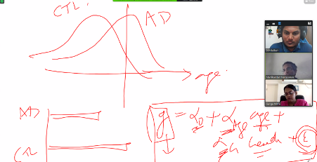 Fig 2. Behind the scenes from a typical pandemic Zoom meeting. Manikandan Narayanan (MN), the corresponding author of the study, is seen here exploring the expected trend for AD and CTL differences using Zoom annotations. Co-first-authors Kailash BP (KBP) and Sanga Mitra (SM) are the other members on this call actively taking notes.