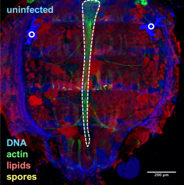 My Ph.D advisor, Prof. Dominique Ferrandon, started collaborating with the team of Prof. Frédéric Delbac (Clermont-Auvergne University, France) that is working on the infection of honeybees by Nosema ceranae and the impact of exposure to sublethal levels of pesticides (3). As the biology of theses parasites remains poorly known for lack of genetically-amenable models of infection, excepted for the nematode Caenorhabditis elegans, we decided to use the model organism Drosophila melanogaster and its cognate microsporidium Tubulinosema ratisbonensis to apprehend microsporidiosis.