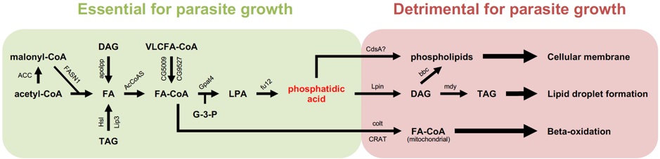 Thus, I, with the help of Gaëtan Caravello, decided to embark on a small-targeted screen on some 100 genes involved in lipid metabolism, with a special emphasis on those involved in fatty acid synthesis or degradation. Conversely, any gene coding an enzyme that uses up a metabolite critically required for parasite proliferation would yield the opposite phenotype. This mapping strategy allowed us to identify phosphatidic acid as a key metabolite. Interestingly, when Gaëtan Caravello injected phosphatidic acid into the flies, the parasite proliferated more intensely and the flies succumbed earlier to the infection (Figure 2).