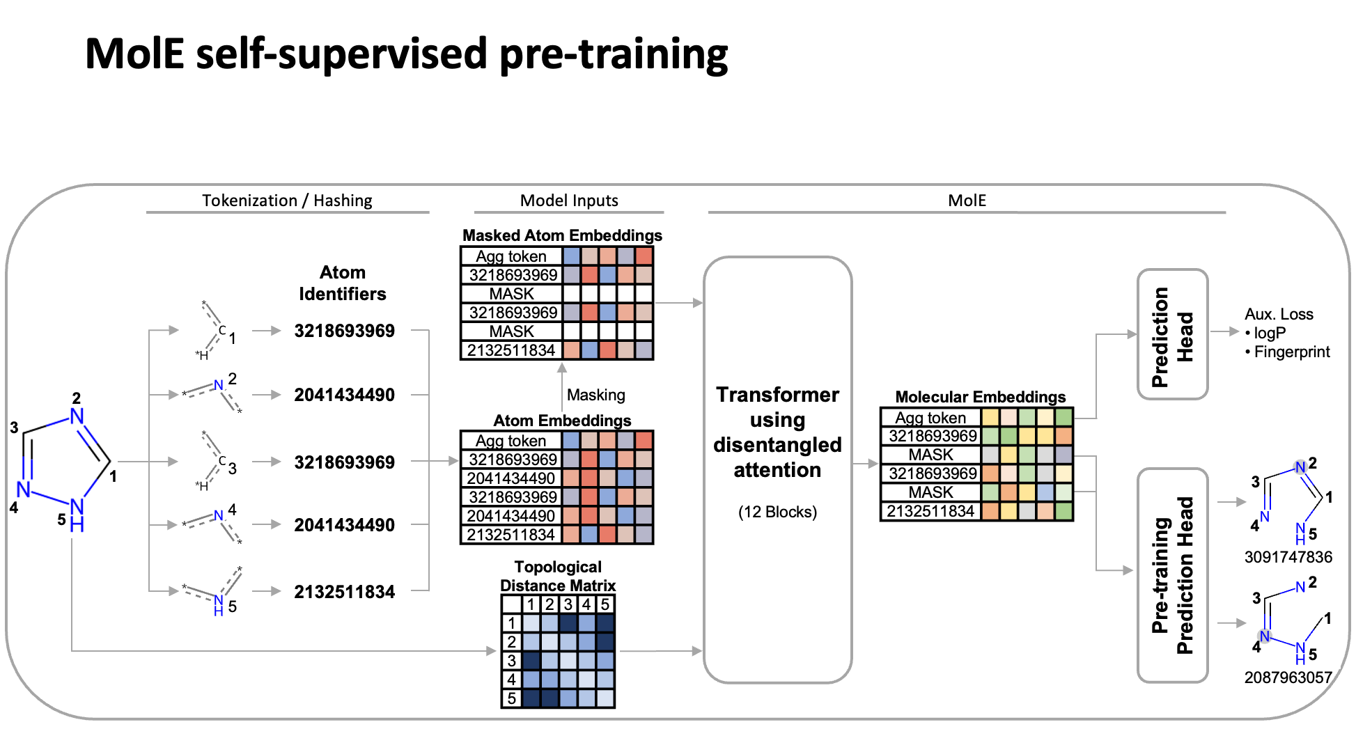 MolE relies on atom identifiers as input tokens and graph connectivity for positioning information from the molecular graphs. We used this data to pretrain the model – transferring from large unlabeled datasets to smaller labeled datasets by randomly masking atoms and having the model predict the corresponding atom environment of all neighboring atoms separated by no more than 2 bonds. We used both a self-supervised approach with approximately 842 million molecules, followed by supervised pre-training with about 456,000 molecules.