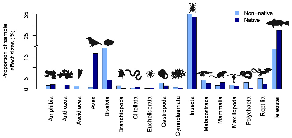At the beginning, I read case studies and found that both positive and negative responses of animal species to EWEs such as heatwaves, cold spells, and droughts (Fig. 1). Those responses were associated with diverse levels from physiology, life history traits, abundance, to community composition. For example, population abundance of native shellfish and corals are vulnerable to heatwaves. Many insect species have weak ability to adjust their physiological thermal limits to resist extreme high temperatures. However, specific to non-native species, I find that some invaders exhibit more tolerance and event positive responses to EWEs than natives. For example, severe drought events resulted in mass mortality of native fishes and facilitated non-native counterparts to occupy vacant niches to establish populations. Non-native arthropods, mammals, and shellfishes have more rapid growth rates, higher phenotypic plasticity, broader tolerance of disturbance, and quicker recovery than natives after experiencing EWEs. So, whether responses of non-native species to EWEs would be completely different to native species. Answering this question needs a comprehensive evaluation of non-native species responses to EWEs from gene, population, community, and ecosystem levels across multiple taxonomic groups with different adaptations, or across a global scale covering a diverse extent of EWEs types.