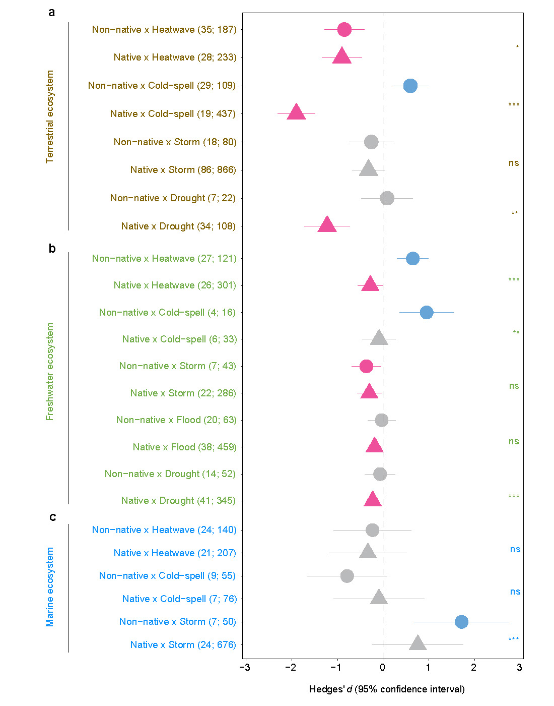 Preliminary analysis supports our assumption that non-native and native animals had large differences in proportions of positive, negative, and neutral responses to EWEs. The proportion of positive responses of non-natives was 95.3% higher than natives. However, surprisingly, the proportion of negative responses of non-natives was also higher (55.1%) than natives. We then applied multilevel mixed-effects meta-regression analyses to compare the responses of non-native and native animal species across terrestrial, freshwater, and marine ecosystems to different types of EWEs. Our results show that less sensitivity of non-native animals to EWEs were commonly found in terrestrial, freshwater, and marine ecosystems. Non-native terrestrial and freshwater animals were only affected by heatwaves and storms, respectively. Native terrestrial animals negatively responded to heatwaves, cold spells, and droughts. Native freshwater animals negatively responded to most events apart from cold spells. For marine species, except for native molluscs, corals, and anemones negatively responding to heatwaves, other non-native or native marine animals were insensitive to EWEs (Fig. 3). Thus, both ‘winners’ and ‘losers’ were true for non-native and native species, but proportionally there were more positive responses of non-native than native animals to EWEs.