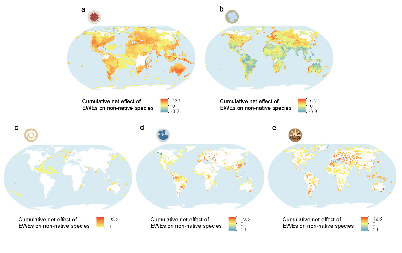To further explore potential joint threats from invasive alien species and extreme weather, we calculated positive, negative, and neutral response ratios of each non-native species to EWEs, and sum of positive and neutral response ratios minus negative response ratios for each species to get a net response ratio. When the net response ratio was greater than or equal to zero, it meant the species was insensitive to EWEs. We overlapped potential habitat areas predicted by ecological niche modeling with the net response ratio of each species and obtained hotspots of the combined risks of EWEs and biological invasions (Fig. 4). Our results indicated that we may pay close attentions to Northern America, Latin America, Mediterranean, South Africa, East and Southeast Asia, southwest Australia and New Zealand, west coast and islands in the Pacific Ocean, and North Atlantic Ocean, where native species may be particularly vulnerable to their joint effects.
