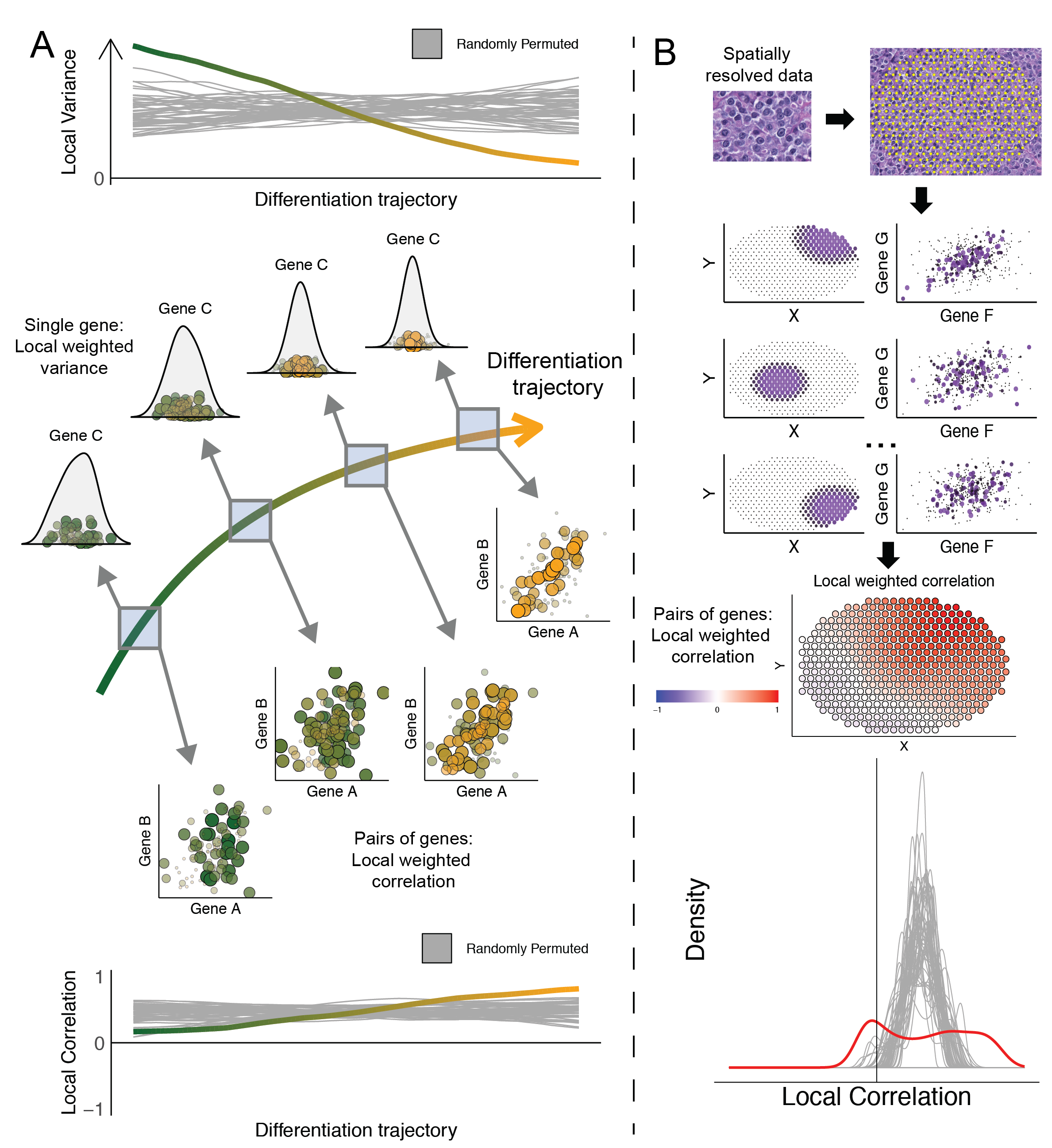 From a methodological perspective, existing tests can compare higher order interactions among discrete groups of cells (e.g. Fisher’s Z-transform test for differences in Pearson correlation between two groups), but require some arbitrary choice to dichotomize the data. These existing tests also do not identify non-linear changes that can occur over a dynamic differentiation trajectory or in the spatial context.