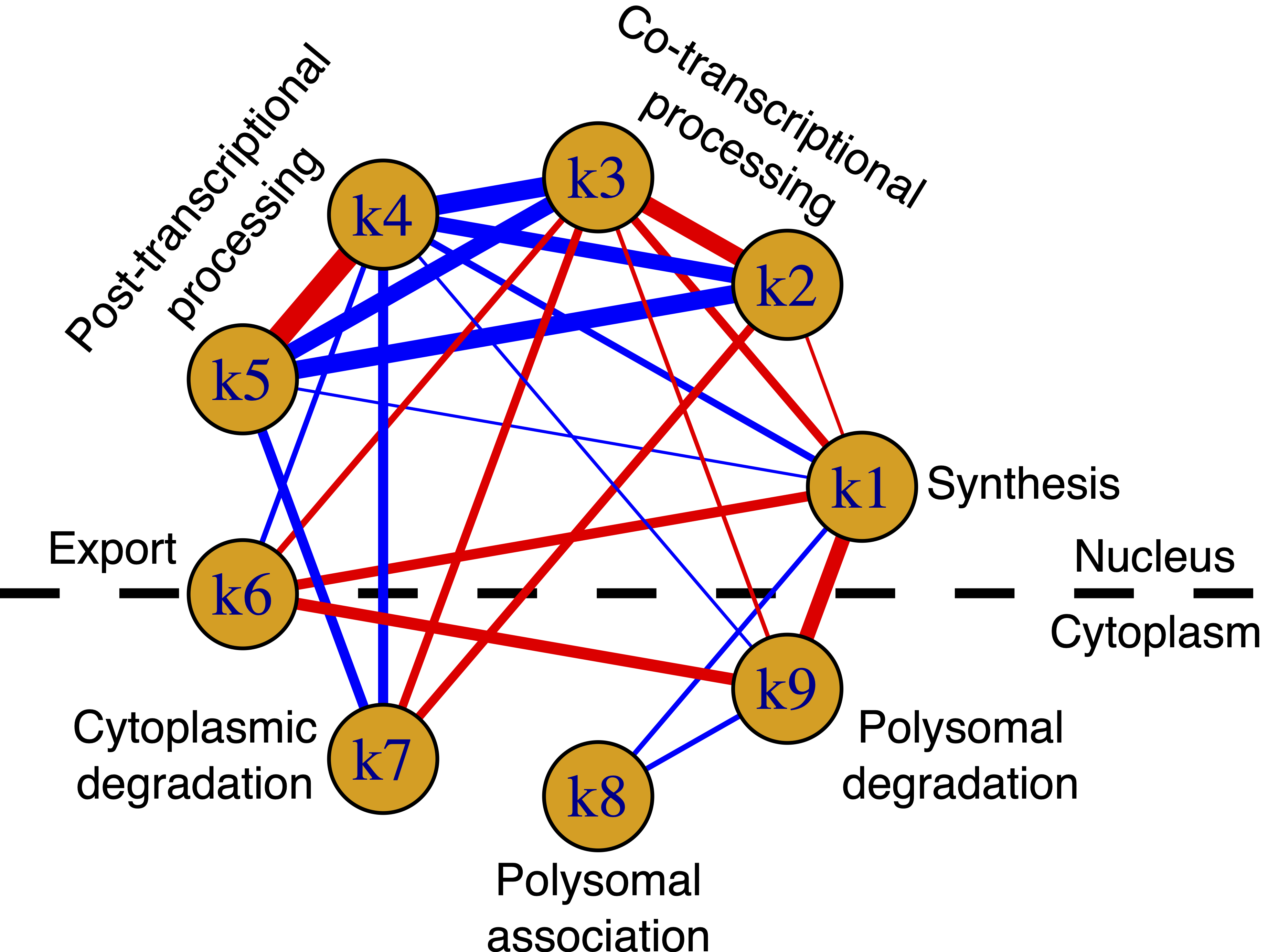Gene expression is the process by which information stored in the DNA is transformed into functional products, called proteins, which perform most of the work in cells. The process of gene expression goes through two major steps: transcription, in which DNA is recoded in another alphabet to become RNA, and translation, in which instructions encoded in RNA are used to make proteins. It is commonly thought that RNA abundance is a good proxy for transcription efficiency. However, the RNA in the nucleus reaches the cytoplasm after a long journey full of stages (RNA dynamics), each of which influence the net amount of RNA that will be translated into proteins. Until recent times, the state of the art in terms of RNA dynamics was limited to the study of RNA synthesis, processing and degradation. When I arrived in Pelizzola’s lab, at the Centre for Genomic Sciences in Milan, to start my PhD in computational biology, I was captivated by the project of Prof. Pelizzola and Dr. Mattia Furlan to deepen the characterization of RNA life cycle by trying to estimate the rates of processing (k2-k5), export (k6), polysomal association (k8) and decays (k7,k9) (see scheme of the RNA life cycle in Figure 1) and I immediately started working on it.