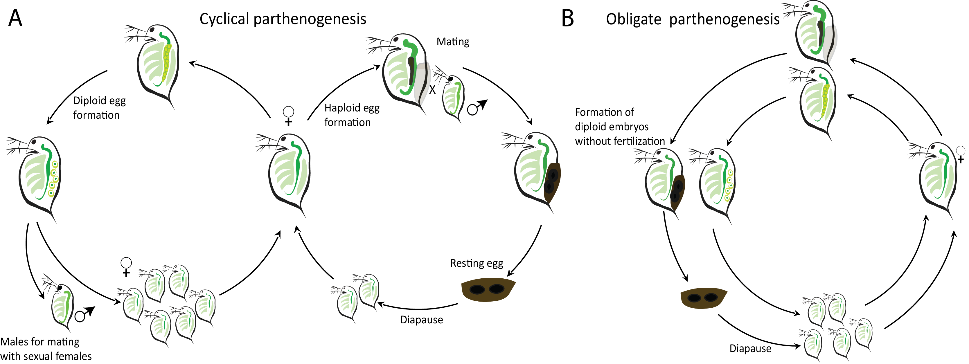 Figure 1. (A) Cyclically parthenogenetic and (B) obligately parthenogenetic life cycles in Daphnia.
