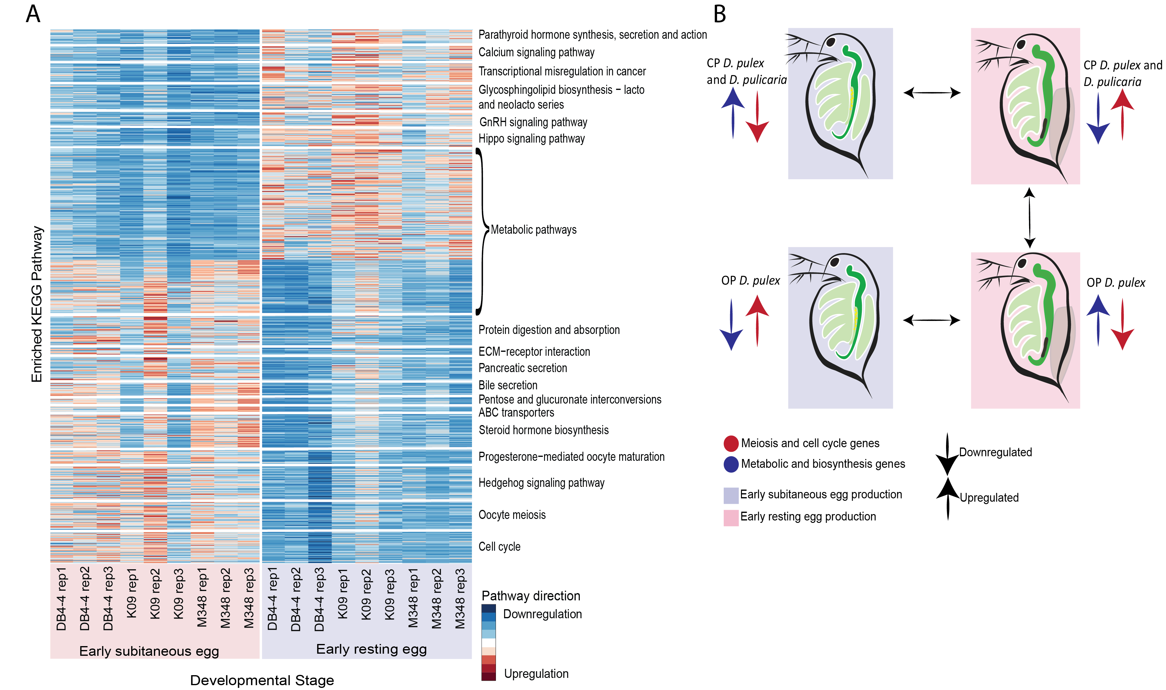 Figure 3. (A) Heatmap illustrating a subset of up- and downregulated KEGG pathways during early subitaneous egg production across all replicates. (B) Summary of pathway regulation across various modes of reproduction in OP and CP Daphnia.