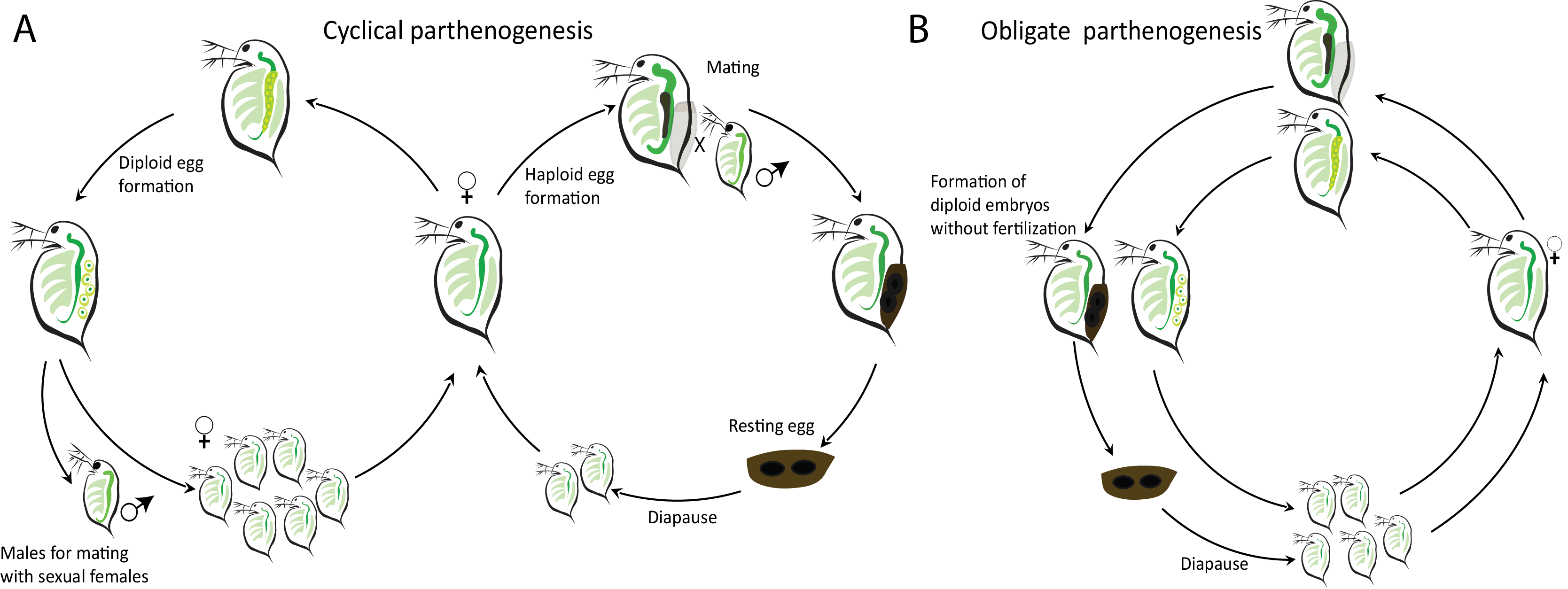 Figure 1. (A) Cyclically parthenogenetic and (B) obligately parthenogenetic life cycles in Daphnia.