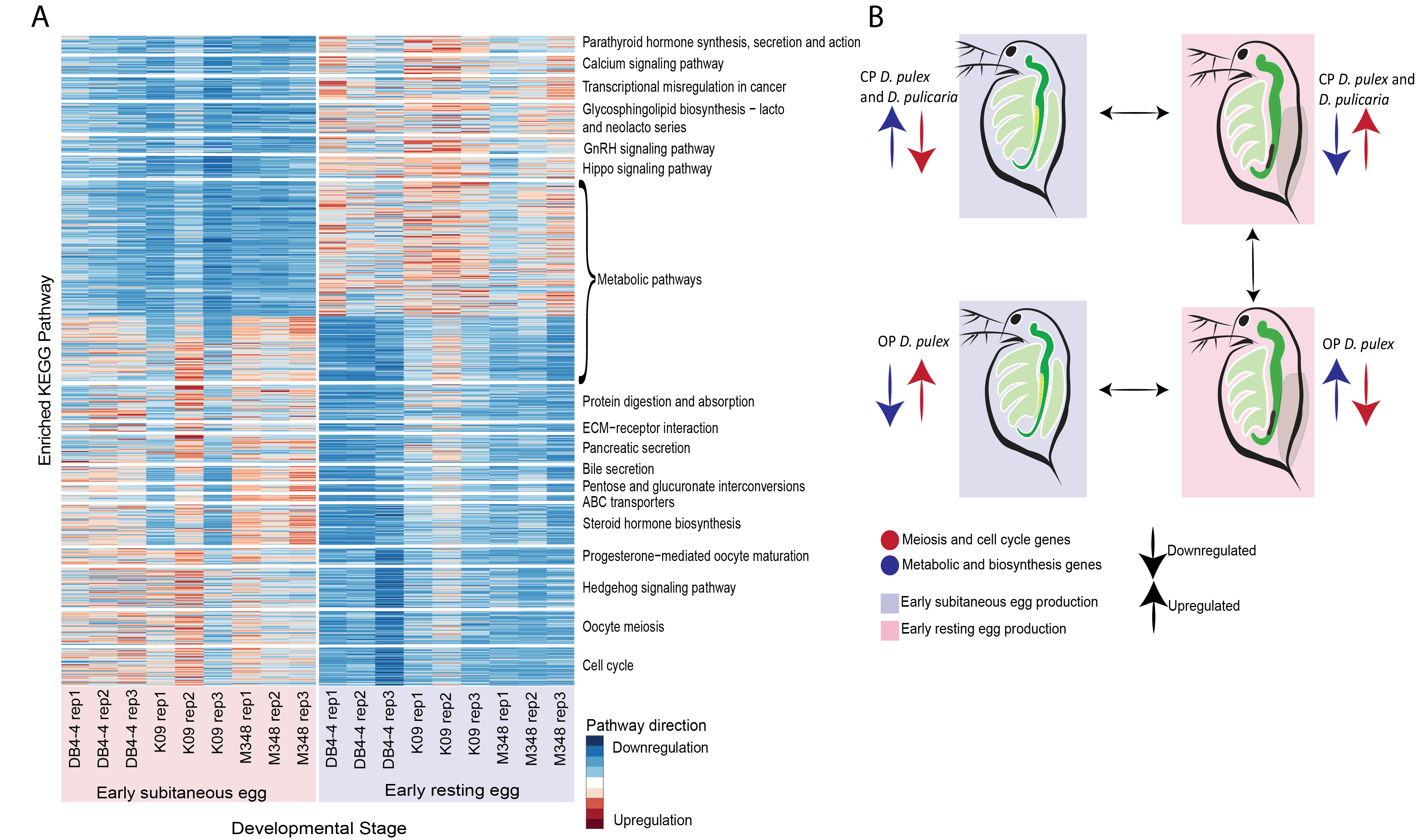 Figure 3. (A) Heatmap illustrating a subset of up- and downregulated KEGG pathways during early subitaneous egg production across all replicates. (B) Summary of pathway regulation across various modes of reproduction in OP and CP Daphnia.