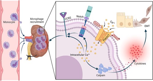 Figure 2: A schematic representation of the renal microenvironment that includes the recruitment of macrophages during renal fibrosis and the activation of mechanosensory ion channels to elicit a pathological response [He 2022].