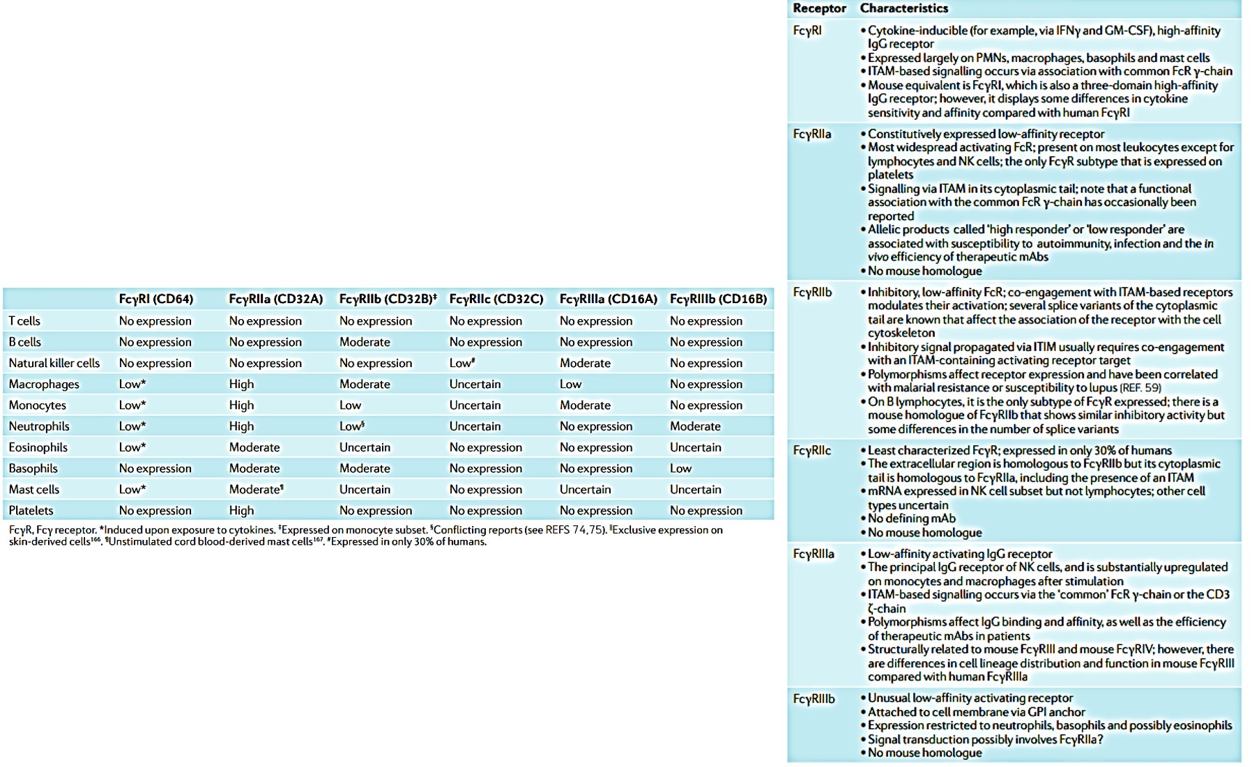 Table 2: (L->R, Zoom in) Distribution and expression of human leukocyte FcγRs and their properties. Key words: CD3, T cell surface glycoprotein CD3; FcγR, Fcγ receptor; GM-CSF, granulocyte–macrophage colony-stimulating factor; GPI, glycosyl phosphatidylinositol; IFNγ, interferon-γ; IgG, immunoglobulin G; ITAM, immunoreceptor tyrosine-based activation motif; ITIM, immunoreceptor tyrosine-based inhibition motif; mAb, monoclonal antibody; NK, natural killer; PMN, polymorphonuclear neutrophil [Hogarth 2012].