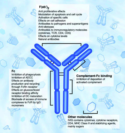Figure 8: Immunomodulatory actions of intravenous immunoglobulin. Intravenous immunoglobulin (IVIG) may be thought of as four separate components: (1) actions mediated by the variable regions F(ab′)2, (2) actions of Fc region on a range of Fc receptors (FcR), (3) actions mediated by complement binding within the Fc fragment and (4) immunomodulatory substances other than antibody in the IVIG preparations [Jolles 2005].