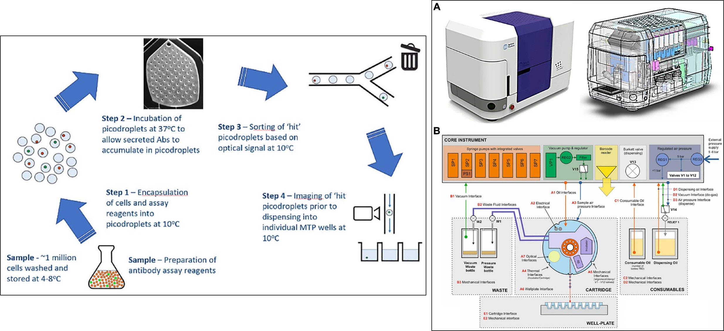 In its mechanism-of-action, the instrument seamlessly encapsulates cell culture samples originally prepared in a preferred culture medium into pico-droplets of culture medium by pumping them through microfluidic channels [Josephides 2020]. A large cohort of cells (hundreds of thousands to several millions) can be encapsulated and processed in a single run. These pico-droplets can be incubated to facilitate the cellular secretion of antibody molecules. The small volume of the pico-droplets allows antibodies produced by a single cell to reach a detectable concentration within a short timeframe.
