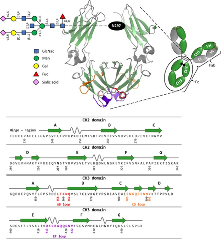 Figure 5: Schematic representation of homodimeric human IgG1-Fc, generated using PyMOL, with the corresponding amino acid sequence [Lobner 2016].