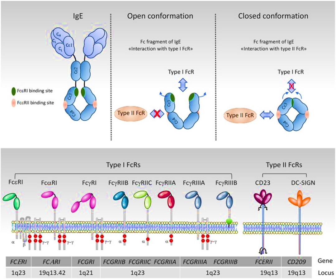 Molecular engineering efforts have also accomplished the development of anti-receptor monoclonal antibodies where intact antibodies, antibody fragments, and small molecules can interact with immunoglobulin-binding domains in activating FcRs. These efforts can block immune-complex mediated cell effects and inflammation, to reverse specific autoimmune disorders such as rheumatoid arthritis [Mkaddem 2014]. Similarly, during allergy treatment, the development of anti-IgE antibodies offer a therapeutic option of recombinant IgE humanized monoclonal antibody E-25, named ‘omalizumab’ across several clinical trials against IgE-mediated allergic reactions [Jardieu 1999]. In its mechanism-of-action, the drug can inhibit IgE binding to FcγRIIA on the surface of mast cells and basophils [Milgrom 1999].