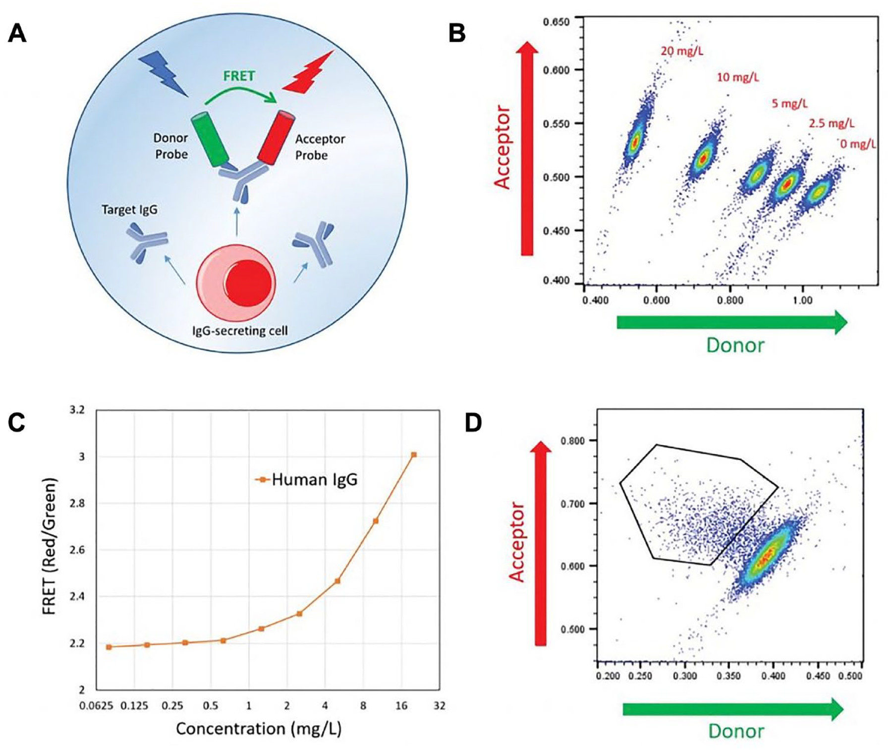 Figure 13: An example cyto-mine IgG secretion assay A) human IgG-specific probes within each pico-droplet bind to secreted IgG to form a three-body FRET complex. B) Scatterplots of FRET signal for pico-droplets contain the indicated concentrations of human IgG with IgG detection probes. C) Standard titration curve D) Scatterplot generated from pico-droplet-encapsulated Chinese Hamster Ovary cells incubated with IgG-specific detection probes [Josephides 2020].