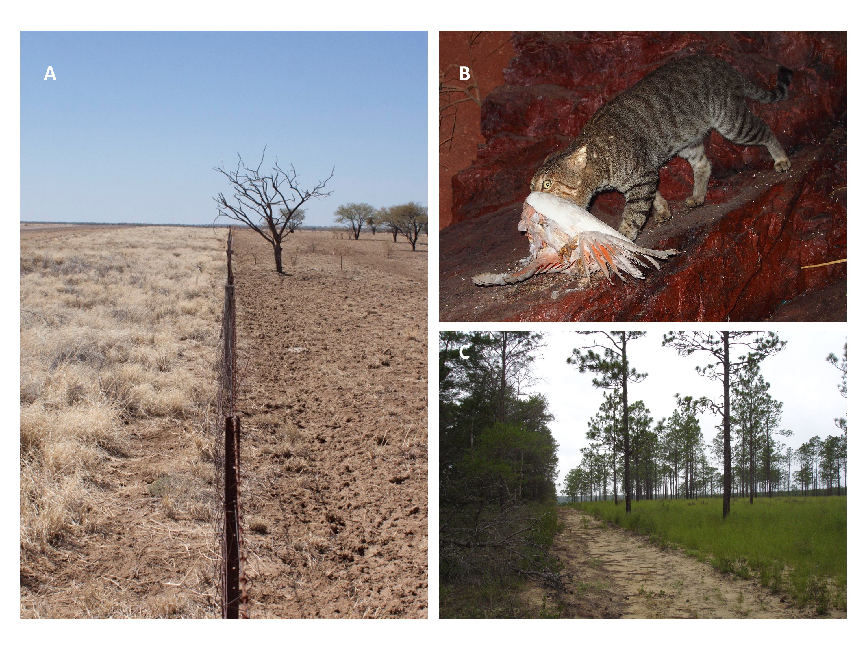 Figure 1. A) Image of grazed (right) versus ungrazed (left) habitat (Photo Credit: Megan Barnes). Protection (enforced by fencing where needed) can effectively stop threats like clearing and grazing. B) Feral Cat with Galah (Photo Credit: Mark Marathon). Active management is required to stop threats such as predation by feral animals and has been shown to effectively halt predation and prevent extinctions. C) Fire maintained landscape with a fire supressed region (left) and a region with decades of prescribed fire (right)within a single protected area (Photo Credit: Gwen Iacona). Active management is required to address threats such as inappropriate fire regimes.