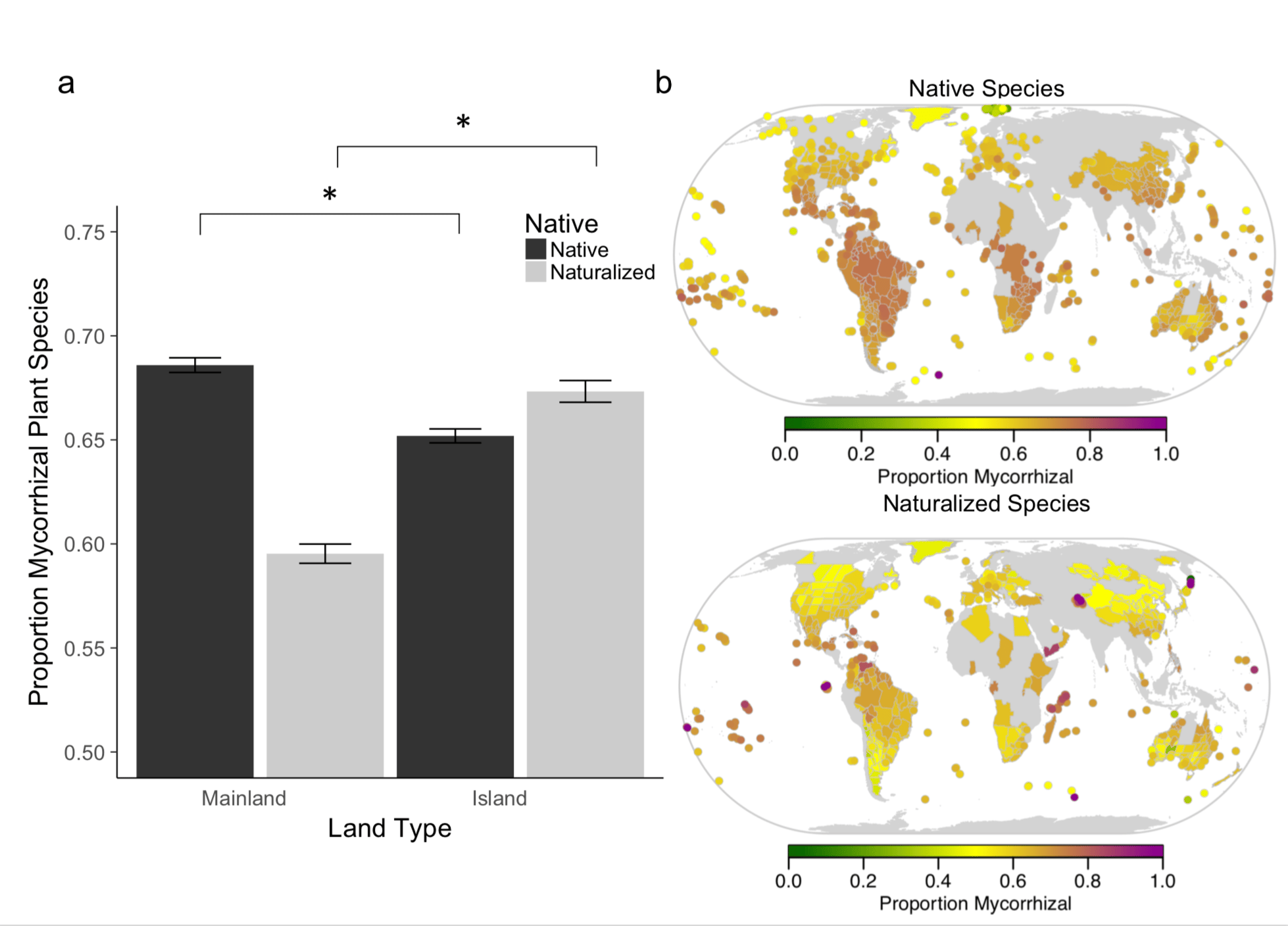 Figure 1. of our paper, showing (a) the major patterns of proportion mycorrhizal plant species in both native and naturalized mainland and island floras. The maps (b) show the distribution of native and naturalized regions used in the study.