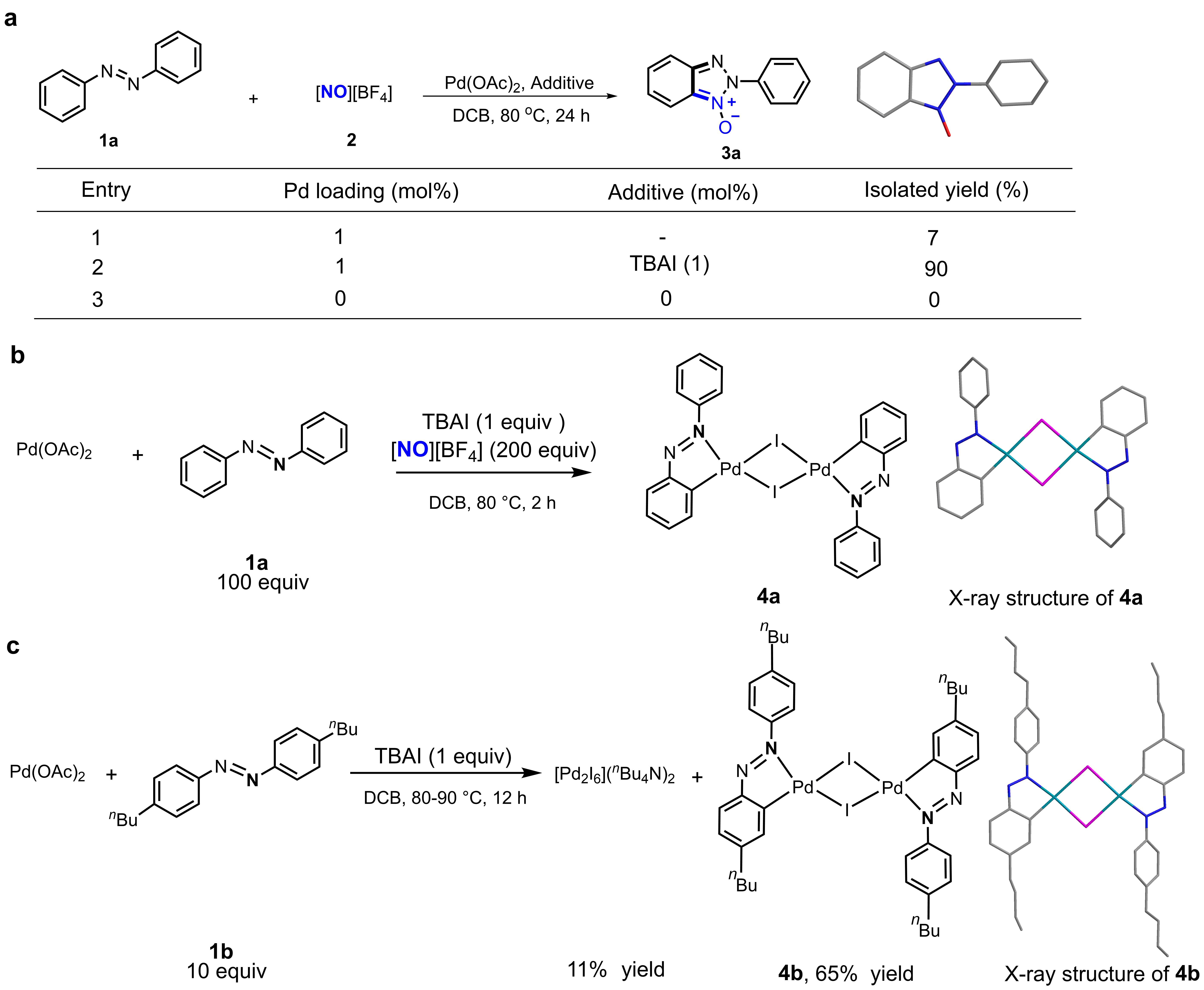 During our investigations of Pd-catalysed ortho C-H bond nitrosation reaction of azobenzenes with nitrosonium tetrafluoroborate, we surprisingly found that the reaction yield was dramatically increased when tetra-n-butyl ammonium iodide (TBAI) was added as additive. The beneficial effect of TBAI prompted us to explore its origin considering that iodine anion has been widely accepted as poison impeding the active metal centre from catalytic cycle. Initially, we mimicked the standard reaction conditions hoping that an active palladium intermediate would be isolated. After trial and errors, we delightedly grew the crystal of 4a of which the structure was unambiguously defined by X-ray diffraction. Duo to the poor solubility of 4a, we realized that the isolation of highly soluble congeners would be decisive for further mechanistic studies, and 4b was synthesized with concomitant formation of [Pd2I6](n-Bu4N)2. Noteworthy, both 4b and [Pd2I6](n-Bu4N)2 could catalyze the C-H bond nitrosation reaction with isolated respectively yields comparable to the standard conditions. Having the idea that 4b might be the active catalytic species in mind, the comparison of the initial reaction rates catalyzed 4b with standard reaction conditions were conducted clarifying that 4b is a kinetically competent for catalyst, and the integrity of [Pd2I2] core structure during catalysis was confirmed by the determination of the order of 4b as well. The formation passway of 4b was experimentally elucidated, and bridge ligand exchange of acetate with iodide was observed. Finally, we applied DFT calculations to unveil the theory explanations for the superior activity of iodide-bridged palladium dimer and discovered that the interesting bimetallic cooperation stems from the trans effect-relay through iodide bridge from one palladium sphere to the other palladium sphere, which facilitates the dissociation of chelated six-membered palladium intermediate generating from reductive elimination, and thus accelerates the catalytic cycle.