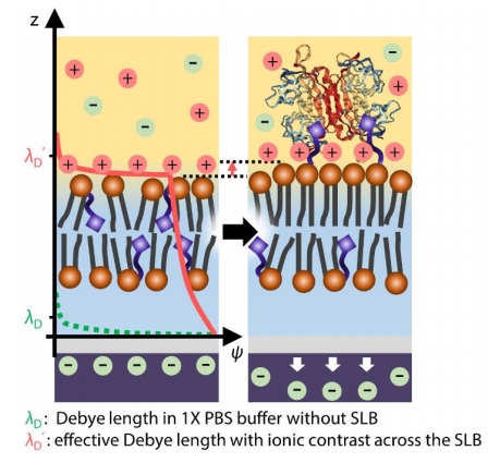 Key finding of our research can be obtained by engineering the buffer conditions across the SLB, which results in fascinating device performance as well as providing methodological tools for understanding the microscopic mechanism during electro receptor-ligand bindings. By placing deionized water (DIW) underneath the SLB, we successively confirmed the role of SLB for improved molecular detectability: i) defect-free coverage of lipid membrane, ii) directional alignment of receptors, iii) prohibition of non-specific binders on the SLB, and most importantly, iv) ion-impermeability of the SLB. Note that the combination of all the ingredients described above resulted in the realisation of reliable signal acquisition in solution at physiological ionic strength via the extension of the effective detection range (=Debye length extension). We found that placing the DIW underneath the SLB is the key for shifting the EDL above the outmost surface of the SLB, translating the lipid membrane into a faultless transducer.