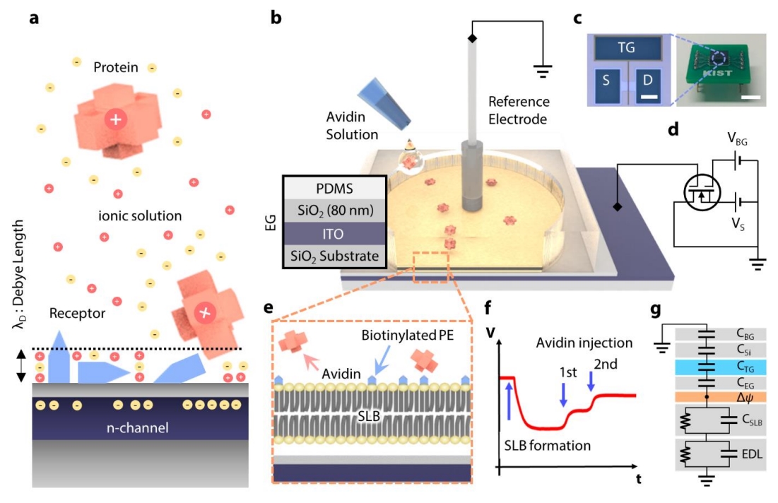 Detection of molecules via surface-sensitive bioelectronics have allowed for portable biomedical devices to implement point-of-care diagnostics to prescreen diseases without temporal and spatial limitations. Despite technological advances in biomolecule detections, evaluation of molecular interactions via potentiometric devices under ion-enriched solutions has remained a long-standing problem. As one of most well-known biomedical platform, field effect transistors (FETs) has attracted considerable attention because of their strength in miniaturization, cost effective mass production, and seamless integration with manufacturing processes. However, , molecular detection with FETs in ionic solutions at physiologic concentrations remains an ongoing challenge, mainly because of the formation of an “electrical double layer (EDL)” over the active sensing probe (Fig. 1a). That is, the EDL means effective and available area for molecular detection. For example, effective detection range, termed Debye length (λD), becomes <1 nm in physiological conditions. This means that molecular detection above 1 nm is impossible under physiological buffer condition using potentiometric devices.